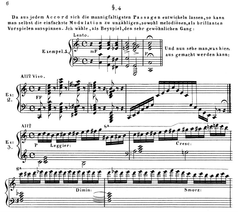 The preceding description of improvisation in Western classical music up to and including Schumann and his milieu  is necessarily incomplete and intends to convey a sense of the over-arching uses of improvisation in a variety of practices, ranging from extemporized performances to an aid for composition. This survey of classical improvisation, traced through the lineage of the Austro-Germanic composers preceding Schumann, also shows where improvisation was practiced: in the courts and in the homes of court musicians, as in the case with Haydn and Mozart; in the church, as in the examples of Bach and Mendelssohn (thus already combining the acts of concert-going and church attendance that would become more prevalent in the nineteenth century); in the salons of the aristocracy, as in the example of the duel between Beethoven and Steibelt in 1800; and in the newly emerging sphere of public concerts, in which context the young Schumann heard Moscheles (in Carlsbad in 1818) and later Paganini (in Frankfurt in 1830) play. Indeed, the public concert became a widespread cultural phenomenon in the nineteenth century and fueled a desire amongst audiences for spectacles of improvisation.4 Virtuosos such as Hummel, Moscheles, Paganini, and Liszt made their name in the concert hall by showcasing their virtuosity and musical prowess through extemporized performances. Although public concert extemporizations were a cultural phenomenon of that time, the list of where improvisation was practiced in the nineteenth century does not feel complete without making reference to the many examples of how it was used at home, most likely alone, either for the process of fueling one's creativity and realizing musical ideas, or with the intention of composing music. The inter-relatedness and inseparability of improvisation to composition (as will be shown in more detail in the chapter On Scales of Improvisation) comes as one of the least surprising findings from the research done to learn how one can improvise convincingly within the context of the nineteenth-century piano repertoire. Not only can improvisation lead to a kind of fixation of ideas in compositions; composition can also play a crucial role in improving one's abilities to improvise; see the expression of this notion here below by the German composer Johann Samuel Petri in his Anleitung zur praktischen Musik from 1782: