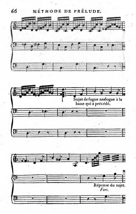 André Ernest Modeste Grétry's Méthode simple pour apprendre à préluder from 1801 (which was published soon thereafter in German) seems to be just such a document. Probably used by the new classes of conservatoire students (its publication just five years after the opening of the Paris conservatoire suggests this possibility), and just as the title implies, Grétry's method presents relatively simple harmonic progressions suitable for preluding in the first half of the book while initiating simple figurations over them in the second half. At the end of the introduction, he states: "Qu'on essaie cette méthode simple; je réponds qu'elle suffit pour devenir harmoniste improvisateur" (Grétry 1801, 4). The method goes as far as to present methods on how to improvise a fugue, including an example in two-part counterpoint with arpeggiated chords (see the first few pages of the sixteen-page fugue that Grétry provides as an example, presented here below), but its contents mainly restrict themselves to introducing the harmonic understanding necessary in order to prelude. Notoriously absent from Grétry's method when compared with his predecessors from the eighteenth-century are figured-bass exercises, or any more serious engagement with counterpoint. The reasons for these omissions in Grétry's method are unclear, but the Czech composer Joseph Drechsler's development as a pedagogue will show that this may have been a trend in music education in the nineteenth century.  Drechsler published his Generalbass-Übungen mit Ziffernbezeichnungen nebst einer Anleitung sammt Beispielen zum richtigen Präludieren in Vienna in 1816, and as the title makes clear, an established figured-bass practice should lay the foundation for further improvisational skills such as those needed for the art of preluding. Just 24 years later, after the establishment of the Vienna Conservatoire in 1817, Drechsler published his Theoretisch-practischer Leitfaden, ohne Kenntniss des Contrapunctes phantasieren oder präludiren zu können in Vienna in 1840. This much more succinct document is reminiscent of Grétry's method in its simple presentation of harmonic progressions that could be used by musicians at the time to play extempore in a convincing manner; and, as the title implies in this case, playing fantasies and preludes could indeed be possible without necessarily possessing a thorough knowledge of counterpoint. Also presented here below, the eighth chapter of Drechsler's Theoretisch-practischer Leitfaden displays an example of a prelude in G minor with a preceding comment "daß man aber auch ohne Beihülfe des Contrapunctes bloß harmonisch gut präludiren könne (that one can also improvise with good harmony without the assistance of counterpoint)" (Drechsler 1840, 65; my translation).7