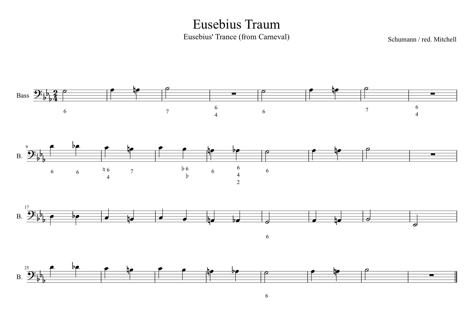 The terms mimesis and morphosis are also in need of an introduction, and I certainly need to explain how my usage of the term mimesis relates to (or actually, intends to avoid) the philosophical connotations associated with the word. According to the Merriam-Webster English Dictionary, the term "has been used in aesthetic or artistic theory to refer to the attempt to imitate or reproduce reality since Plato and Aristotle.” My intention is not to expound on the possibilities of the musical results here representing reality or nature, but rather to expose actions within the world of practice that align themselves more with the basic definition of the word, hovering between imitation, miming, and mimicry. Also negotiating the ideas of simulation and play, "mimesis [...] usually translated as 'imitation,' is not a simple duplicating, but a selecting, emphasizing, condensing way of representation, which might rather be called 'emulation'" (Rapp 1984, 142). Simulating or emulating something through piano playing could be one way of describing mimesis in musical performance. Acknowledging the role of repetition but also how mimesis simultaneously exhibits variation and change, I will immediately provide an example that I believe shows a high tendency towards mimetic behavior. Comparing the three versions of Eusebius Traum shown below should expose how these three "instances" of music (performed according to relatively strict parameters that are explained in the Eusebius Traum subchapter of the chapter On My Improvisation Methods) tend towards behavior that I consider to be highly mimetic. So how does mimesis in music-making work, and what is mimetic about Eusebius Traum? The guidelines behind the three performed instances of Eusebius Traum (namely to follow the figured-bass reduction of Eusebius from Schumann's Carneval, Op. 9 – a copy of which can be found here to the right as well as in the subchapter Eusebius Traum – while using figurative material reflective of a particular sketch in Schumann's first catalogued sketchbook) restrict the performer's choice of certain musical elements, for example harmonies and melodic figurations, such that the three versions turn out to be quite similar in many respects. Each performance lasts about two minutes and exemplifies a harmonic structure that can be described as having an ABA form, reflective of the figured-bass score that restricts the way the music unfolds. Each performance exemplifies piano playing that remains within a certain dynamic range (between p and mp), maintains a generally slow tempo, and exhibits generous amounts of dissynchronization (i.e. that the hands often do not play notes simultaneously).