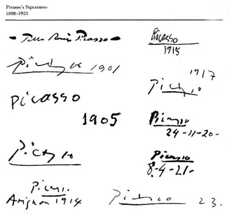 And what about the elements in a musician's sonic signature that may in fact change over time, or those that are integrated into one's playing at a later stage? As previously stated, the process of integrating elements into a sonic signature leave new traces that, alongside the others, become characteristics that make an individual's sonic signature unique. A handwritten signature may also reflect processes of adaptation and change, although it is also commonly used as a tool for recognizing the singularity of a particular signer over the course of time. For example, Pablo Picasso's signature between the years 1898 and 1923 demonstrates both consistent and differing elements, as can be seen here in the example to the left. Although these signatures vary from each other and reflect his diverse usage of contour and line, they also show characteristics that expose them as coming from a singular source. The musical examples in this project are diverse and varied, as shown in this chapter with the examples of Humoreske and zart, but they all display elements that are part of and therefore co-create my sonic signature.