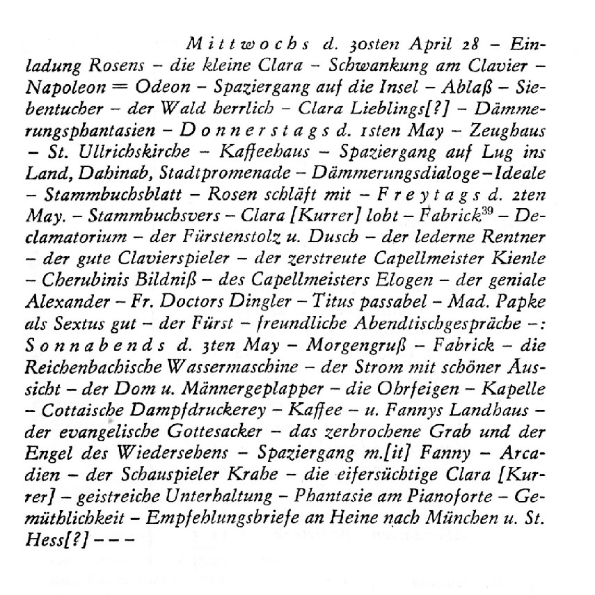 This page displayed here on the right (Schumann Tagebücher Vol. 1, 411), from Robert Schumann's journal outlining events from the 30th of April until the 3rd of May 1828, includes two items that expose his enthusiasm for improvisation: