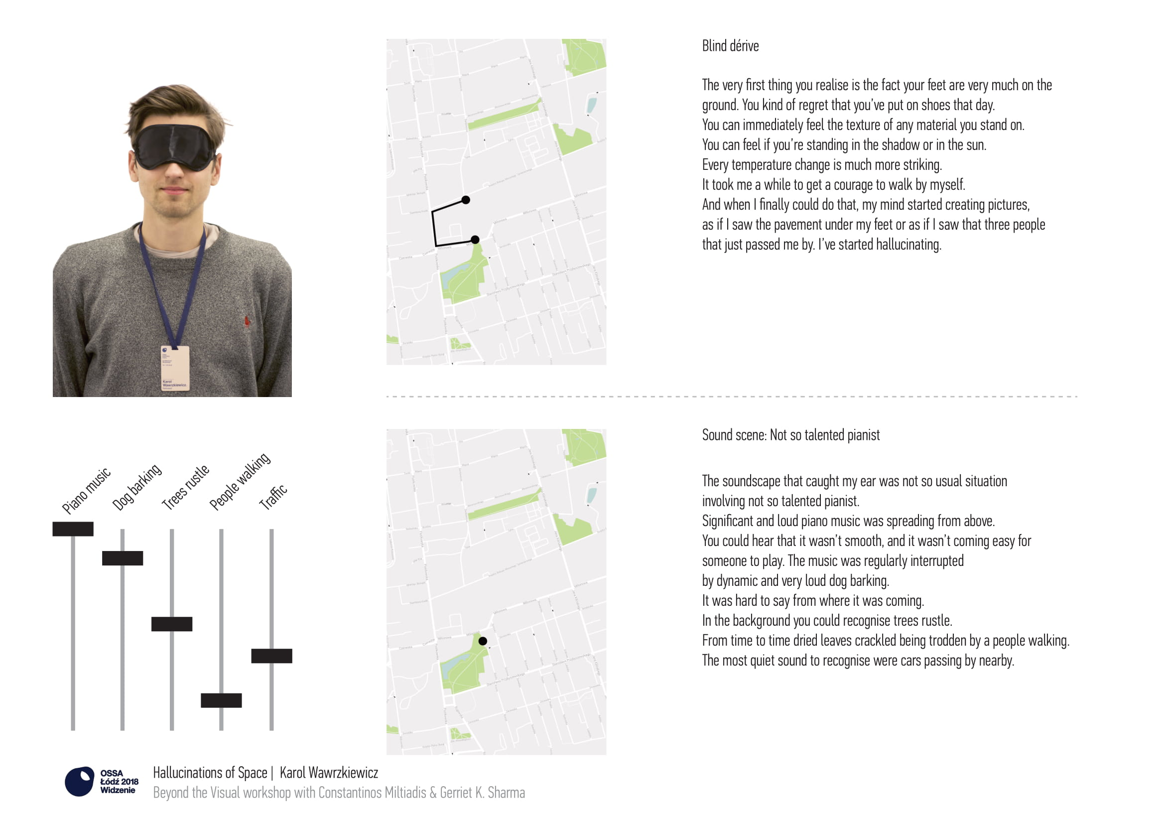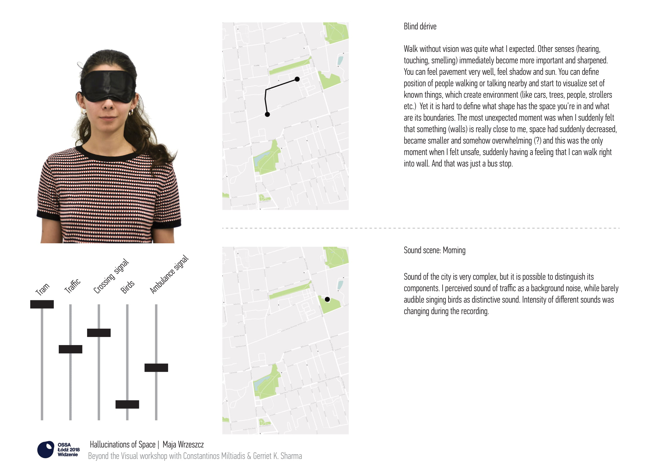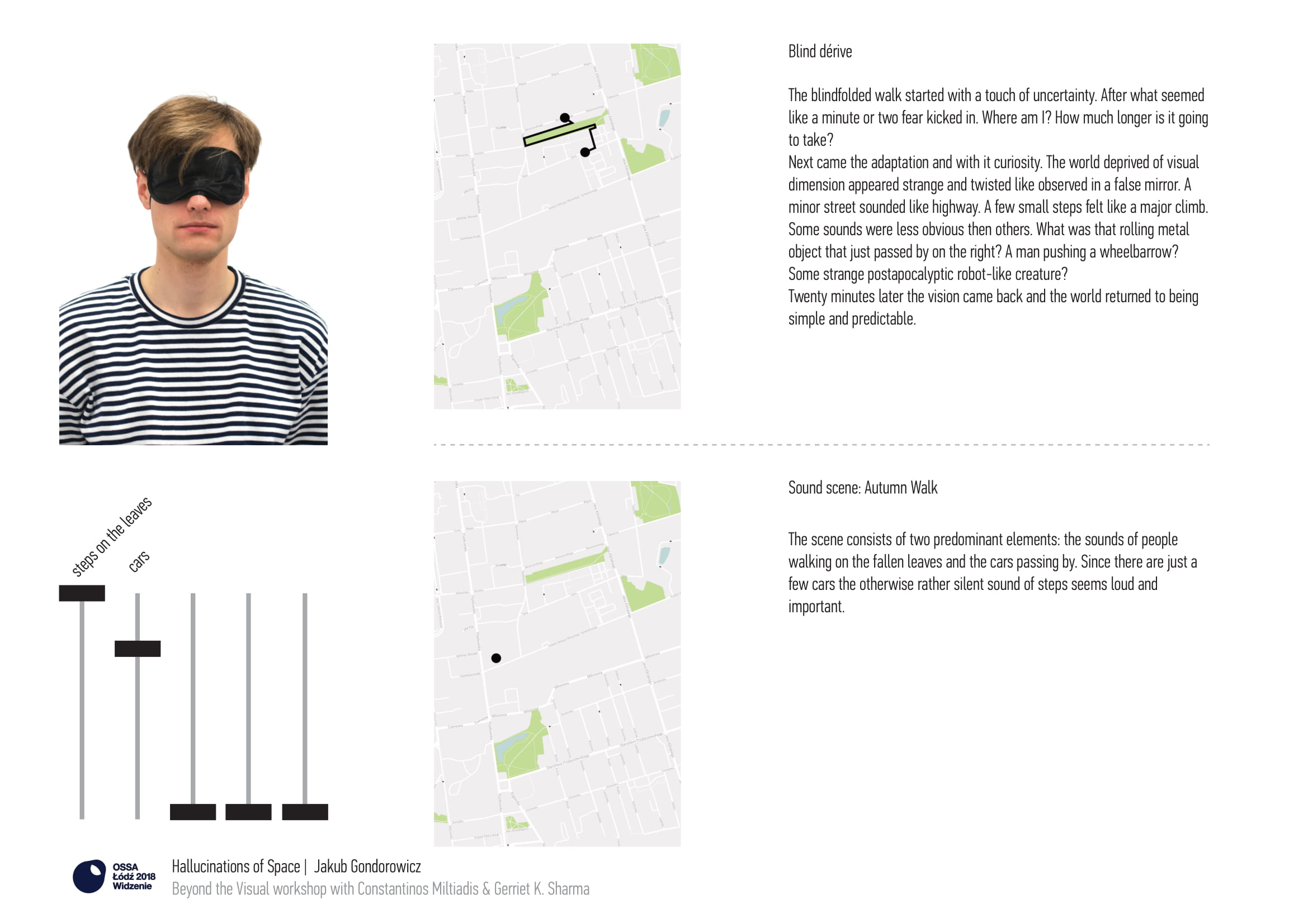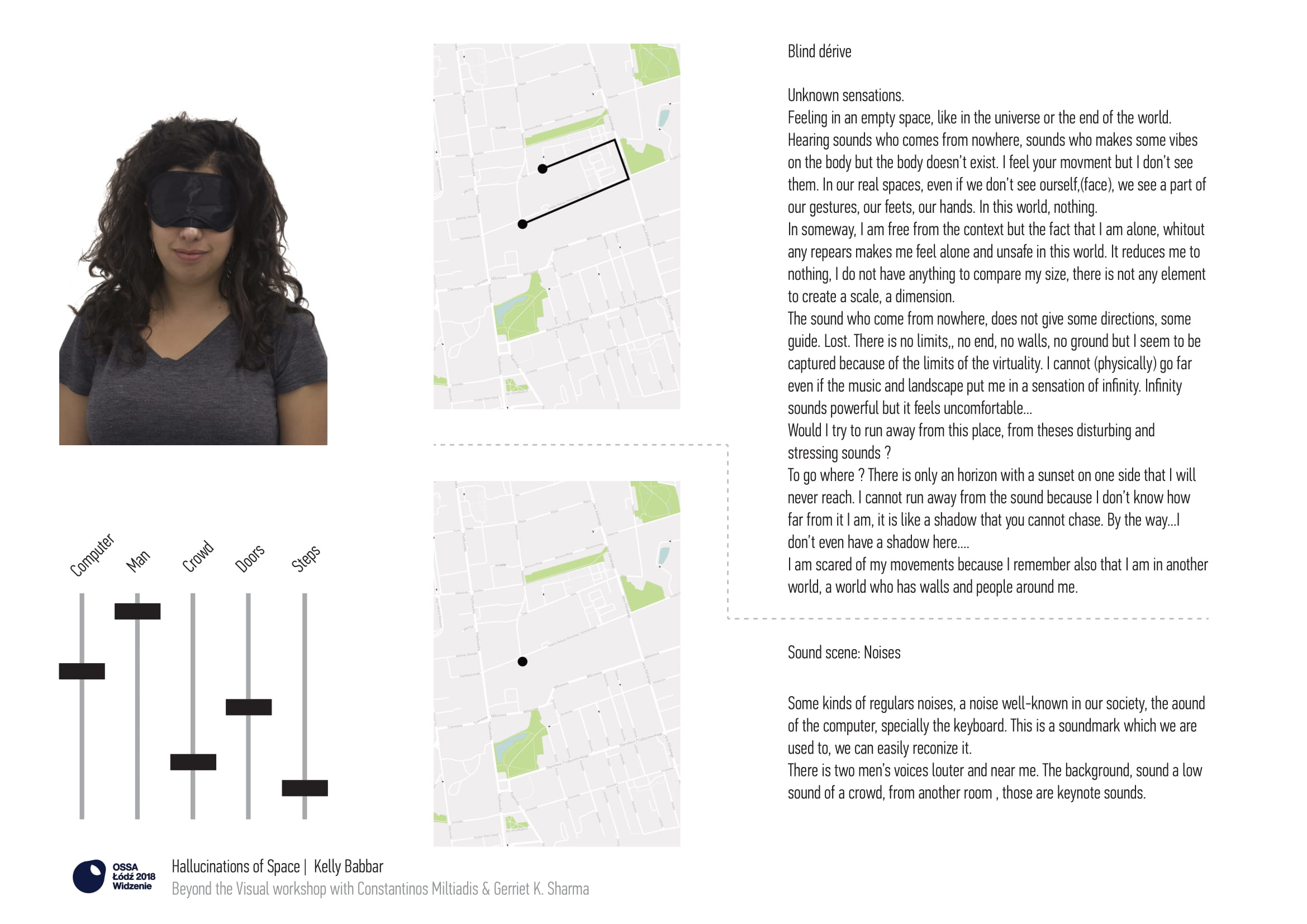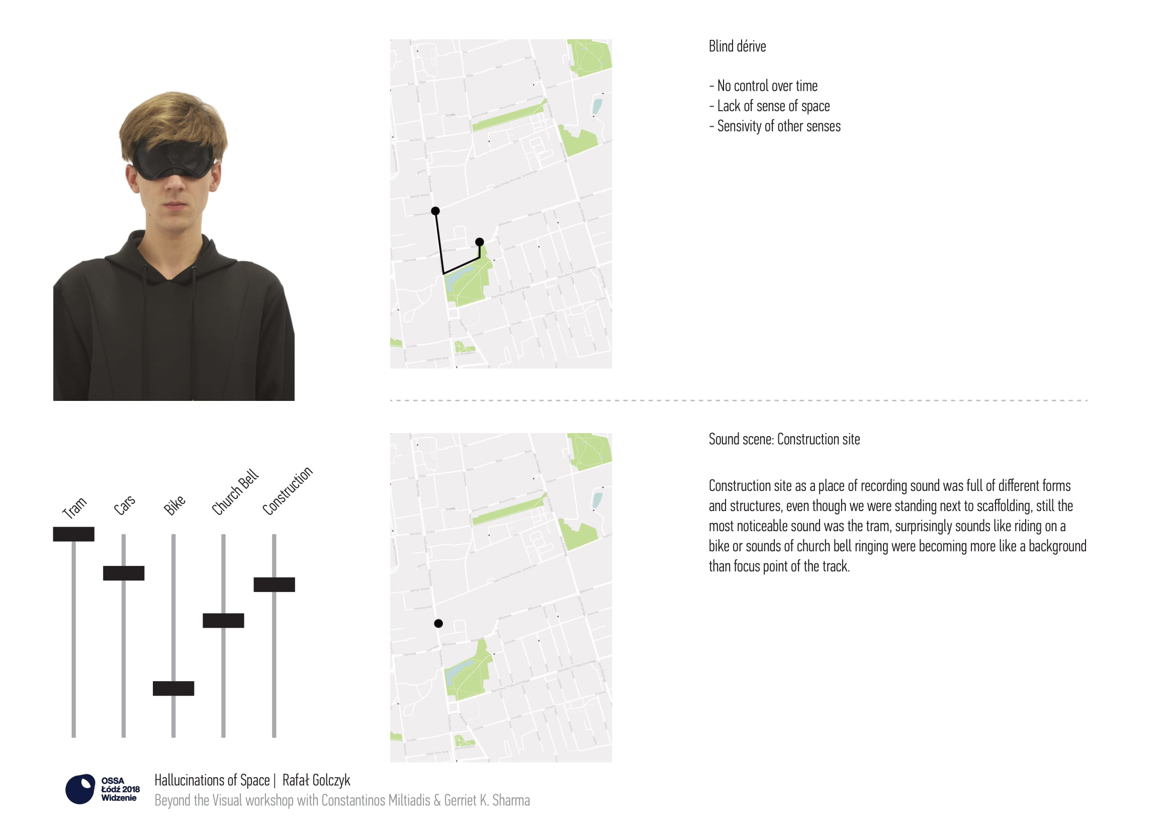 The process was both experiential and cognitive. On the one hand, the task cultivated a sensory experience asking participants to take the time to acclimate and 'open their ears,' which was further exaggerated by the use of the blindfold that destabilized habitual perception. And on the other hand it encouraged a cognitive and creative process of mapping and discussing such experiences. Just as dérive and psychogeography activities produced maps that articulated the city through subjective experience, 'sound scenes' here are attempts to articulate sequential spatiotemporal frames of experience.