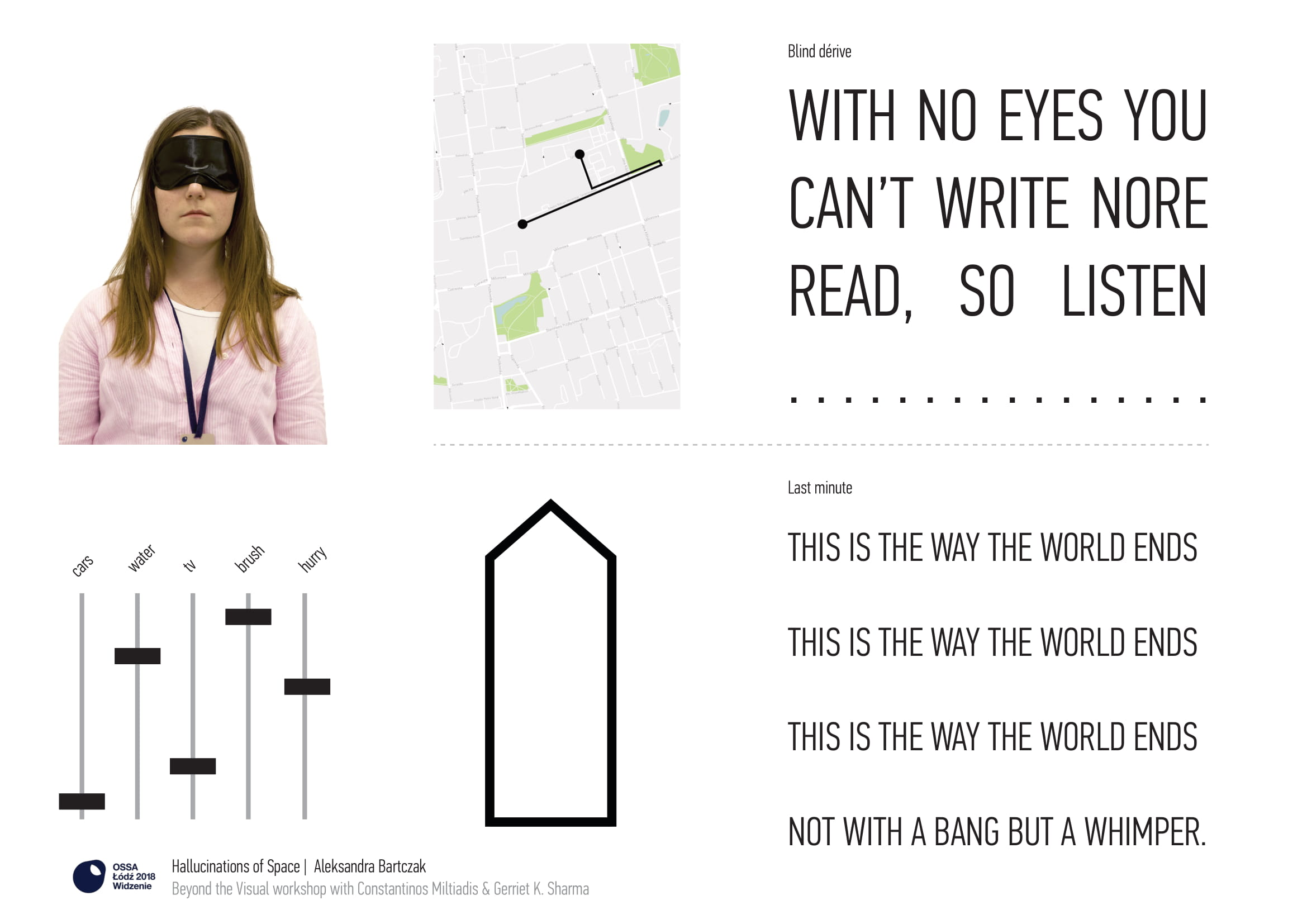 First task: Move as a pair through the city, for 15 minutes, with each participant blindfolded with an AED, and holding their partner's hand as a guide. Concentrate on sounds. Try to map surroundings, distances, events, directions, and atmospheres. Partner helps listener navigate safely, and records the path.