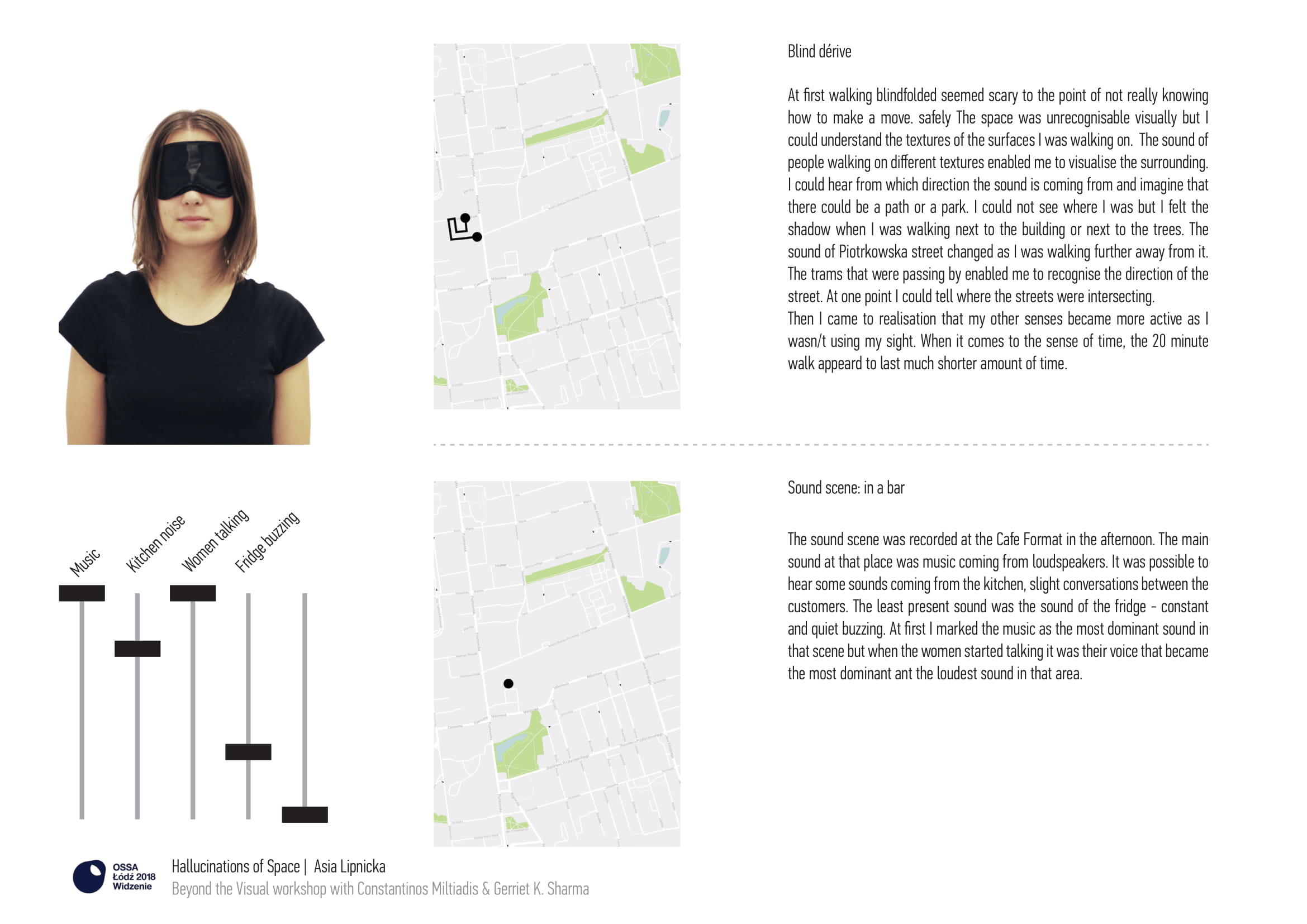The process was both experiential and cognitive. On the one hand, the task cultivated a sensory experience asking participants to take the time to acclimate and 'open their ears,' which was further exaggerated by the use of the blindfold that destabilized habitual perception. And on the other hand it encouraged a cognitive and creative process of mapping and discussing such experiences. Just as dérive and psychogeography activities produced maps that articulated the city through subjective experience, 'sound scenes' here are attempts to articulate sequential spatiotemporal frames of experience.
