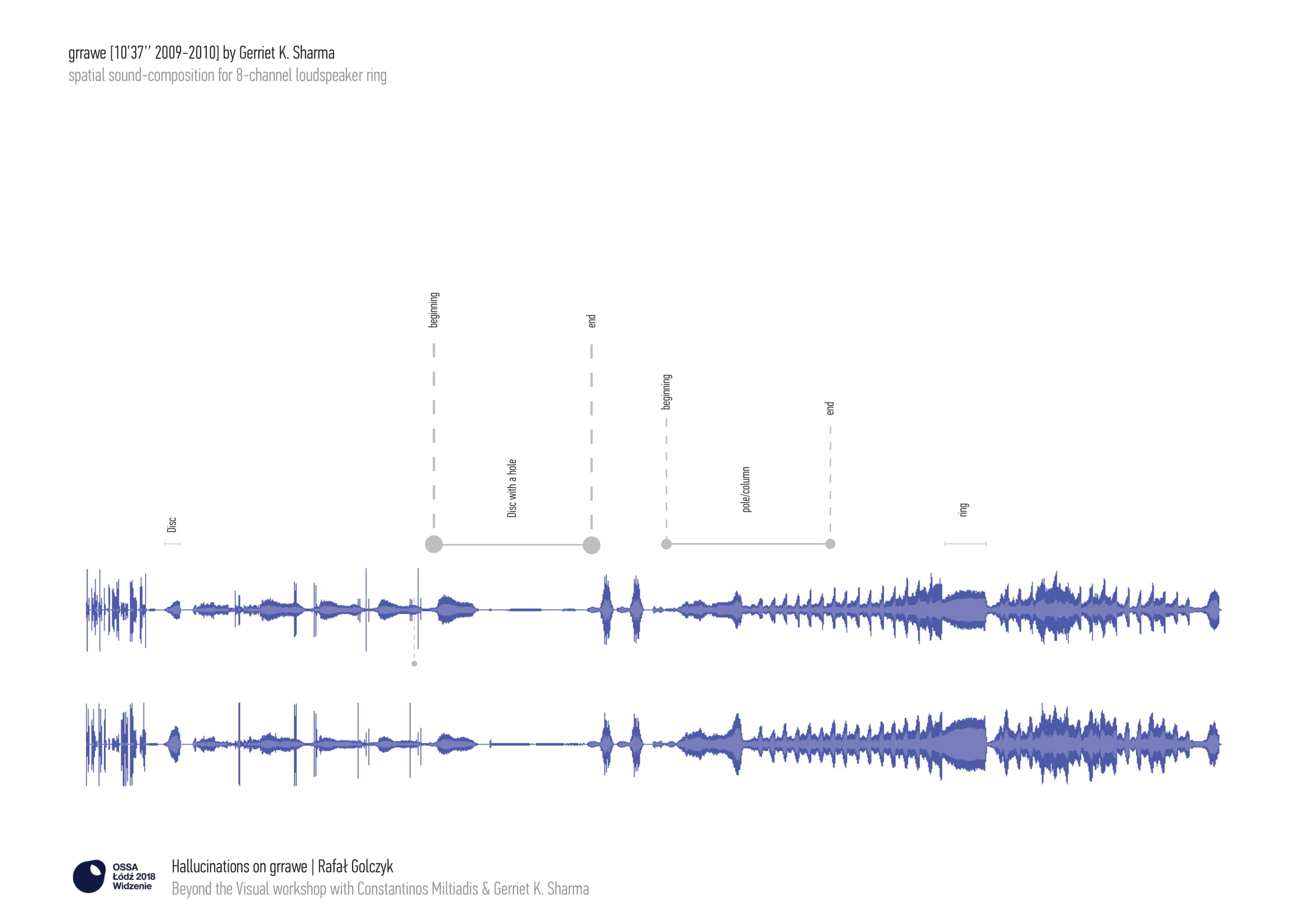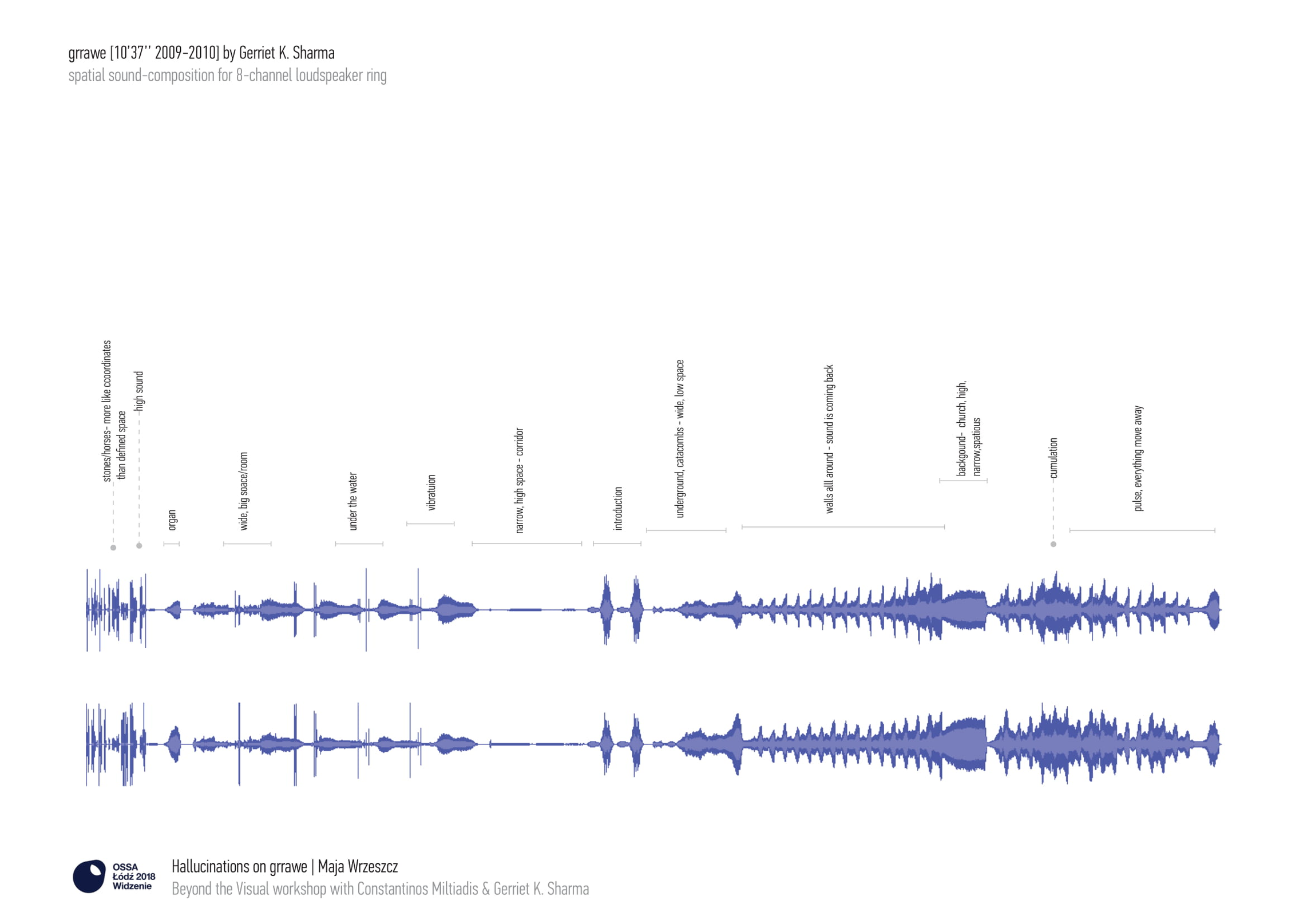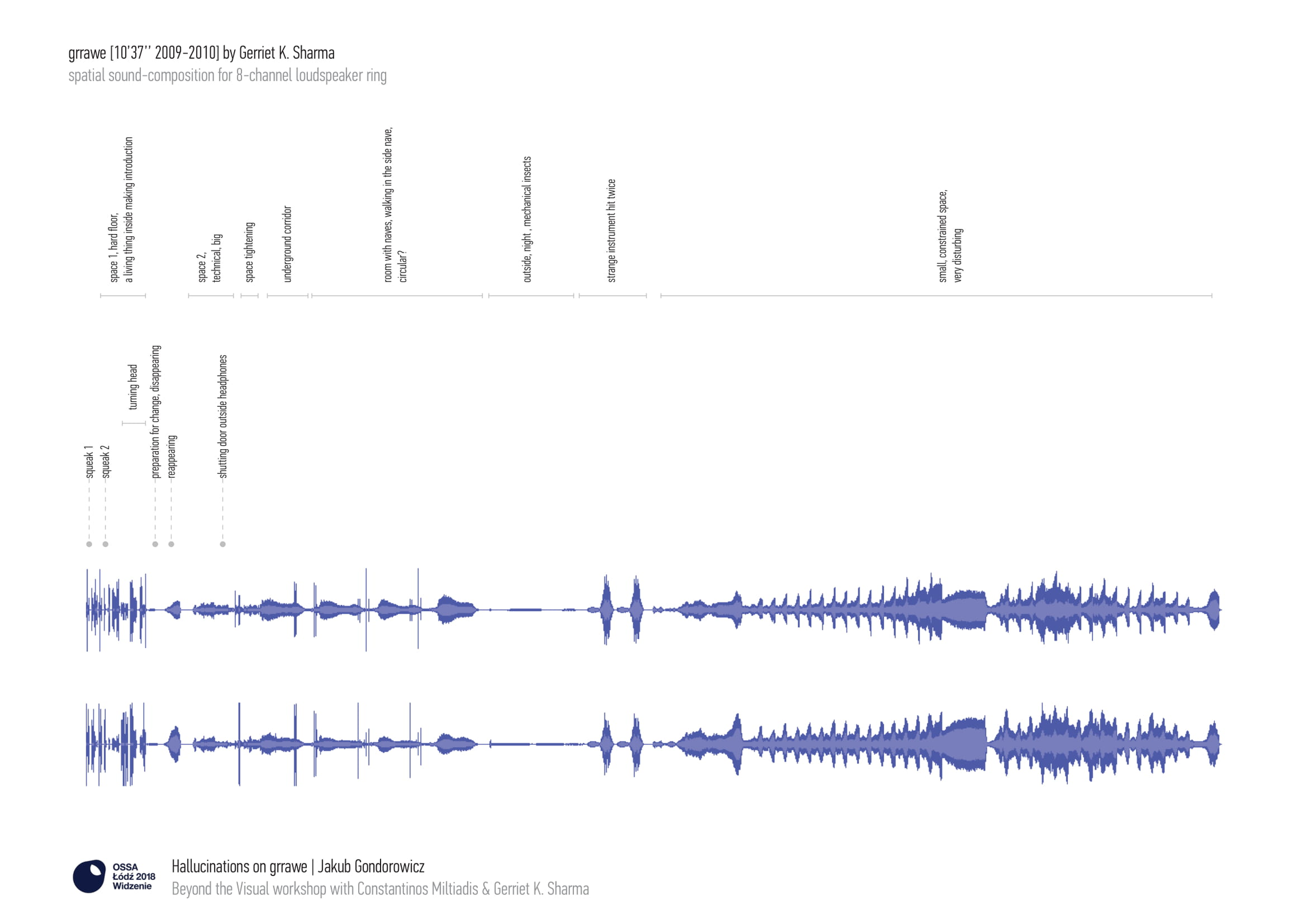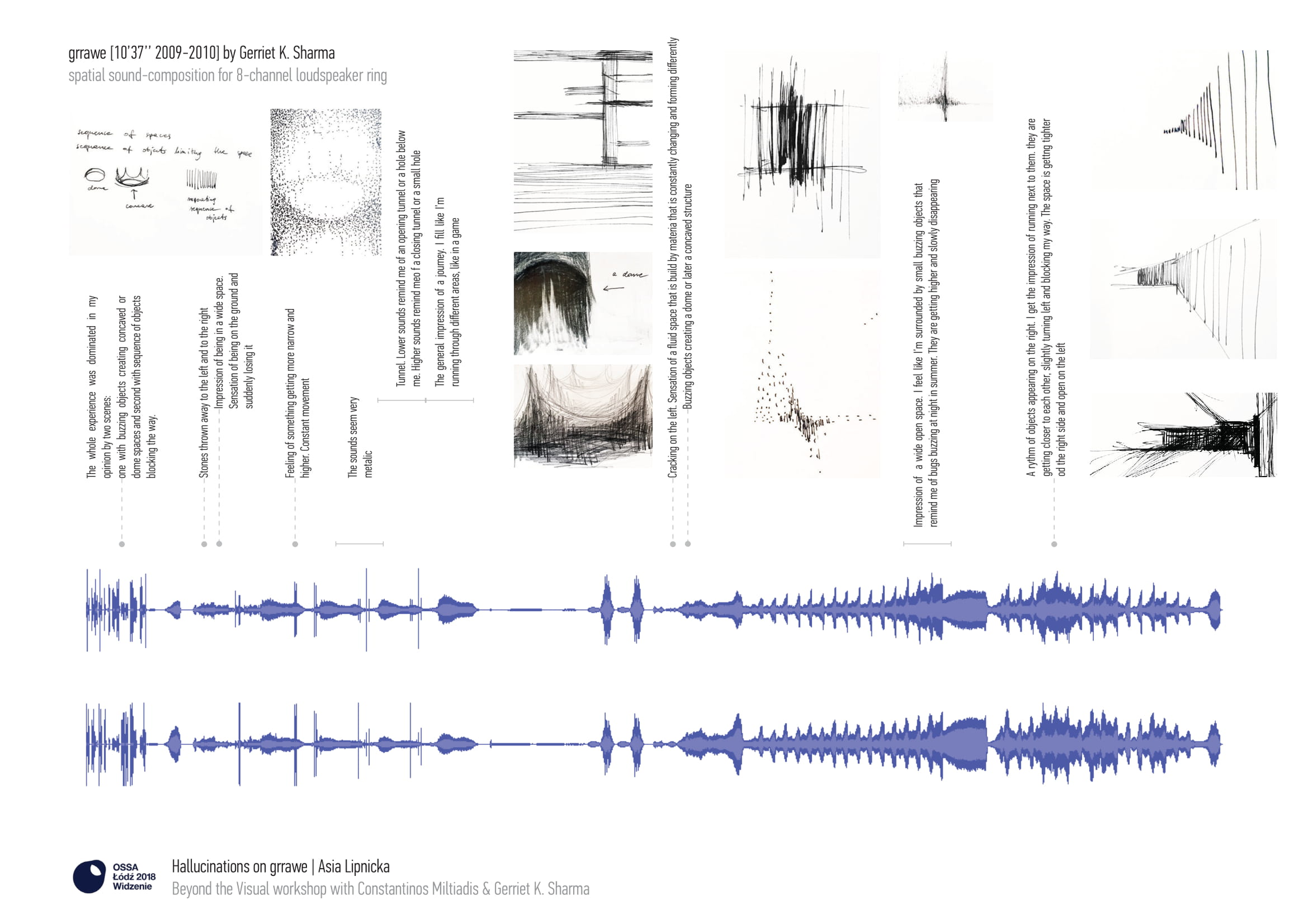 Wearing blindfolds as AEDs, the participants performed blind listening experiments of the binaural piece 'grrawe' in order to focus on its spatial qualities through hearing. Then, they were asked to put down the spaces they 'saw' through this experience, which was carried out in two ways: through notes and descriptors, marked on the waveform timeline, that concerned particular moments or time segments of the piece, as well as via sketches that visually articulated and elaborated their impressions. The experiences and 'hallucinations of space' were presented and discussed within the group in addition to the context of the previous readings and exercises.