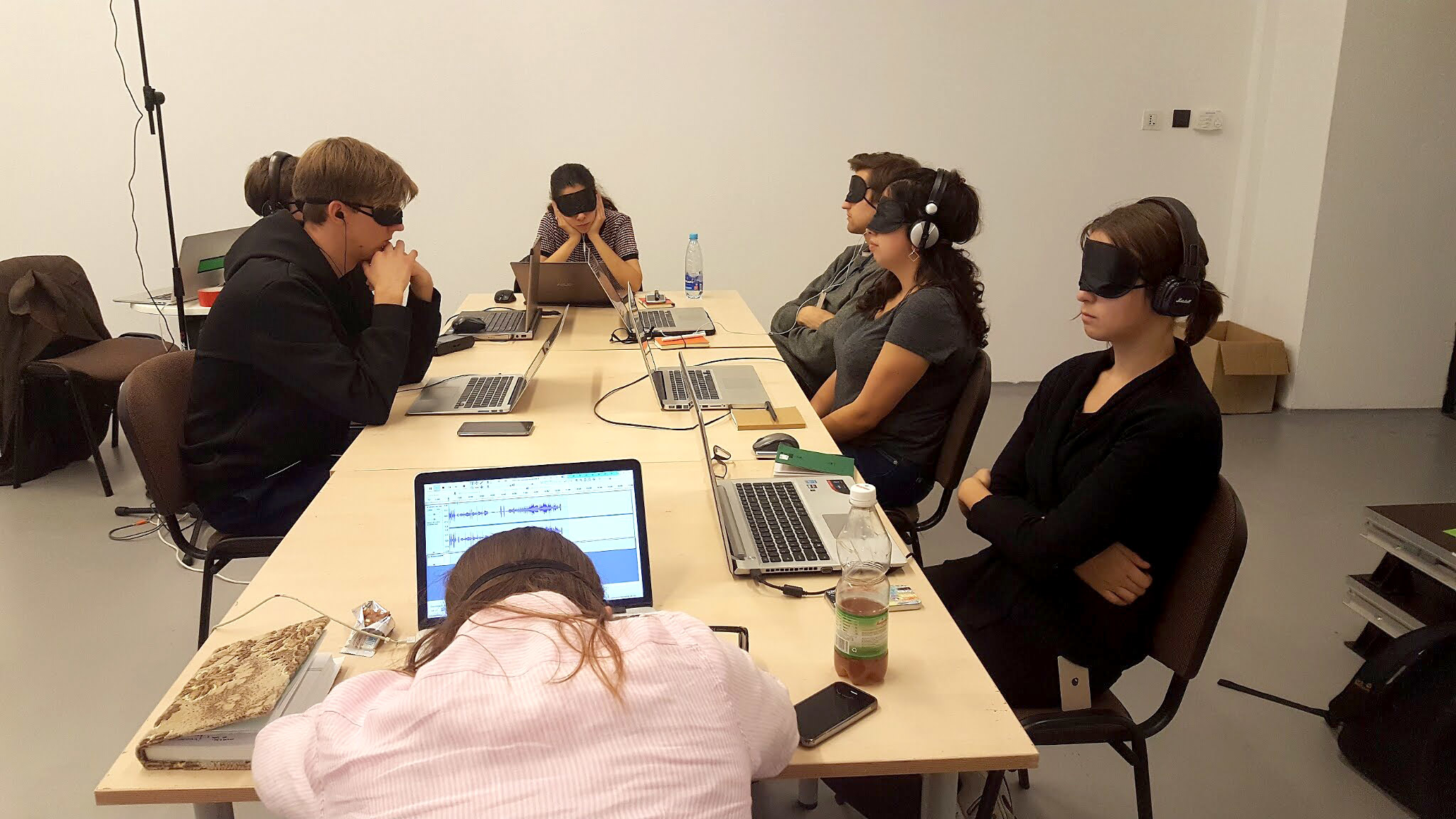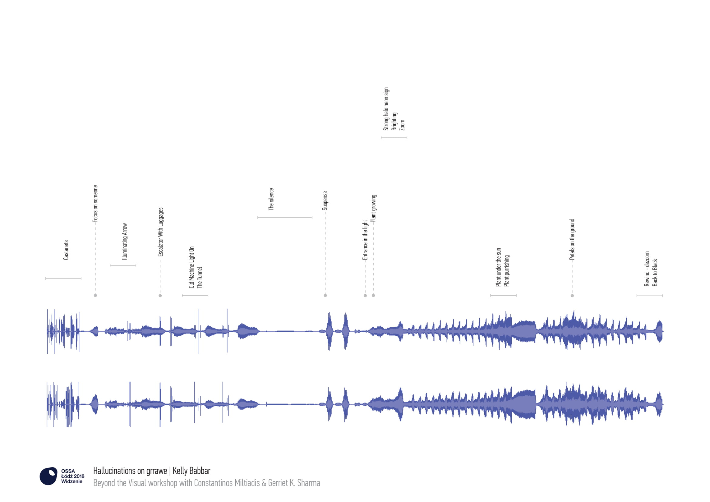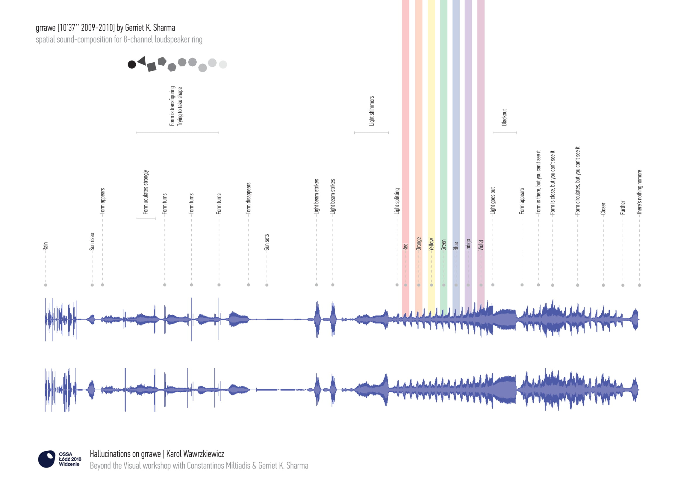 Wearing blindfolds as AEDs, the participants performed blind listening experiments of the binaural piece 'grrawe' in order to focus on its spatial qualities through hearing. Then, they were asked to put down the spaces they 'saw' through this experience, which was carried out in two ways: through notes and descriptors, marked on the waveform timeline, that concerned particular moments or time segments of the piece, as well as via sketches that visually articulated and elaborated their impressions. The experiences and 'hallucinations of space' were presented and discussed within the group in addition to the context of the previous readings and exercises.