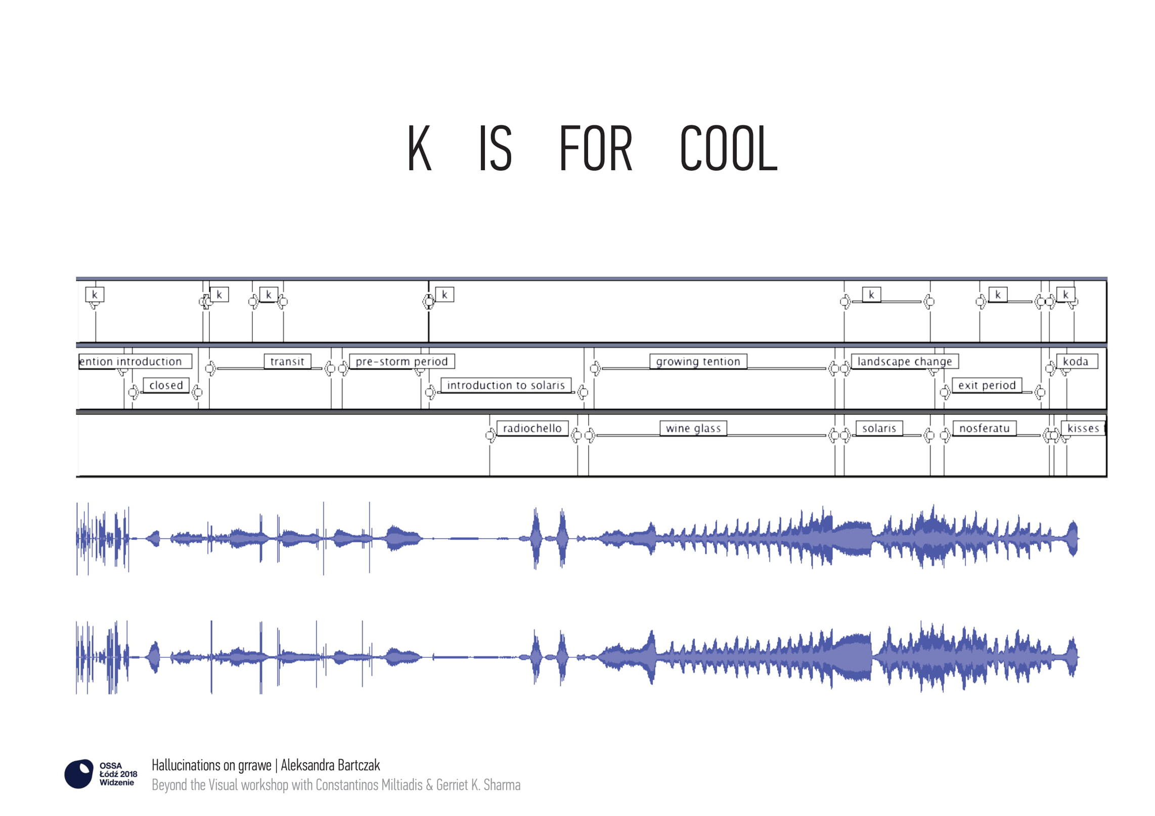 The waveform in the slides (right) is loosely aligned to the timeline of the piece so that they can be paused and inspected against each other.
