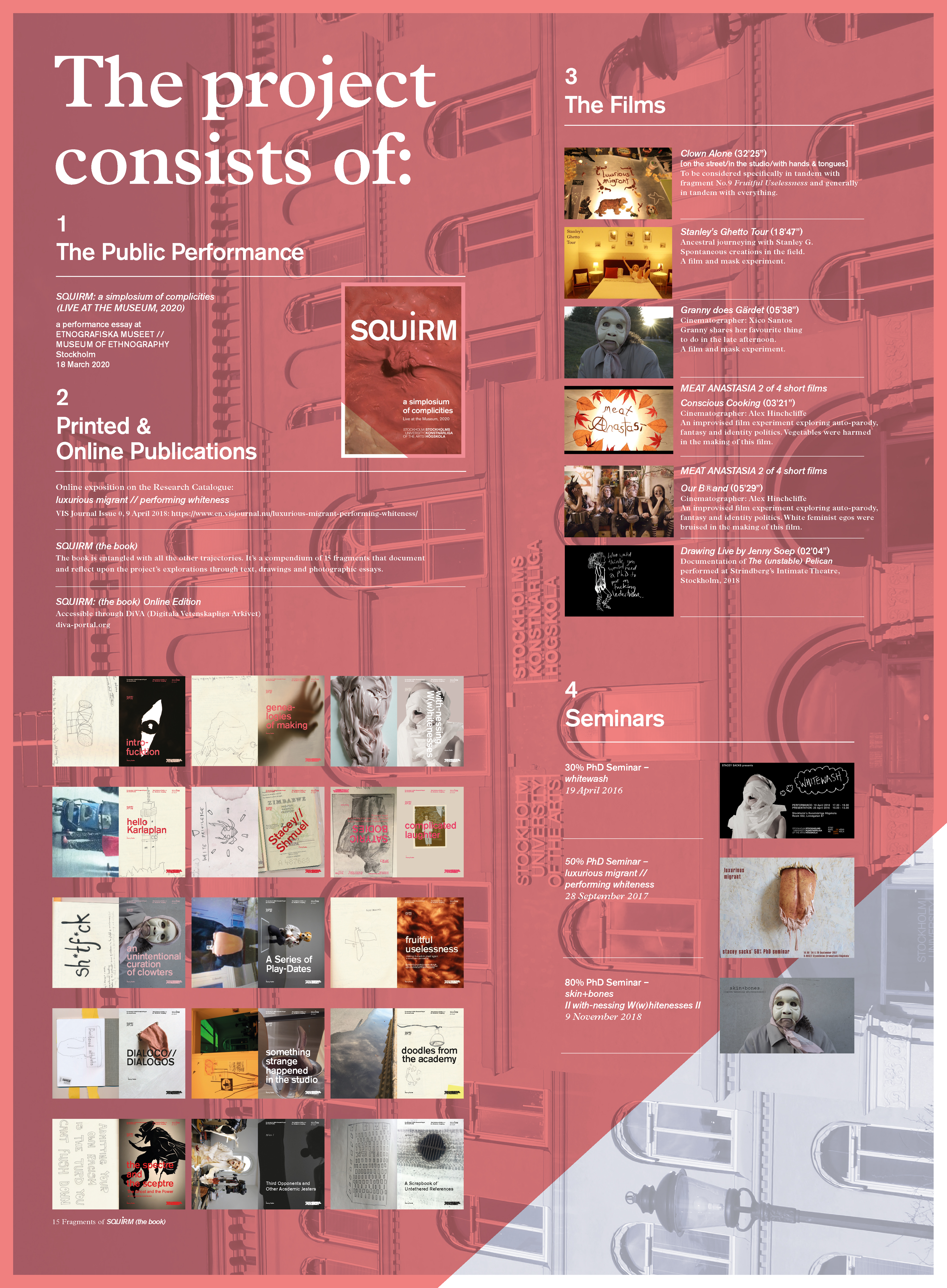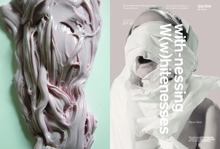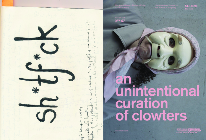 This Untethered Buffoon or the Trickster in Everything is a documented artistic research project (Doctoral Thesis) in Performative and Mediated Practices, comprising a series of excavations and vivisections of W(w)hiteness through clowning, making and thinging. This work/play traverses the fields of critical whiteness studies, performance and clowning, visual and cultural anthropology and decolonial critique. This eclectic mash-up of history, memory and trauma unfolds from my original question: as an actor, which bodies is it appropriate for me to inhabit? Via hyper-disciplinary experiments of the impulse and what it means to be ‘on’ the moment, the research fabricates a series of clowters, performed entanglements of clown and character passing between various continents, temporalities and situated histories. SQUIRM is the title given to both the final performance essay as well as to the reflective documentation emerging from this research. As experimentations with auto-ethnography and productive discomfort, the performing essays in SQUIRM document, animate and satirise explorations of W(w)hiteness, privilege and colonial logic. At the intersections of histories, they dig through remnants of collective memory, personal genealogy and shame, in the hope of reassembling new, sharper ways of giving and receiving attention. From inside the body of this performer SQUIRM is about TONGUE-ING, about licking the future into softness by reinvigorating ancient clown practices to poke at whiteness in the current age. It’s about squirming and laughing through the discomfort of privilege in what feels like a crumbling time. But mostly it’s about feeling great in a beard.