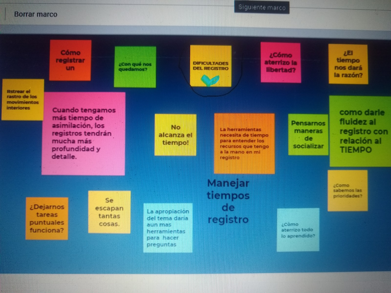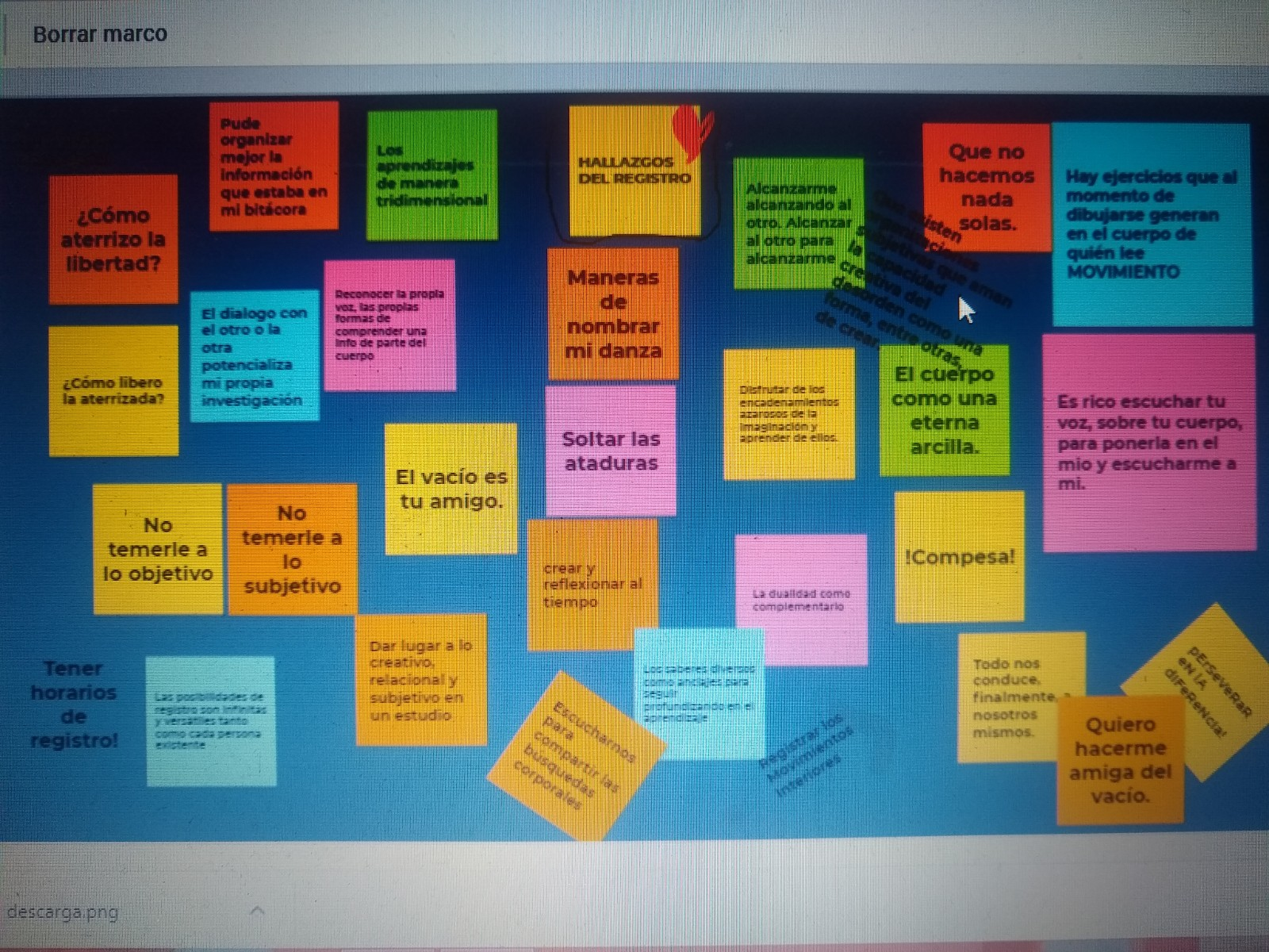 El 07 de julio, realizamos la 1ra socialización de las bitacoras. Este dia cada baialrin-investigador expuso su bitacora al equipo, la diagramación y las preguntas en relación al movimiento que de este registro surgieron. Este ejecicio eniquecio y motivo a pensar la estrategias de registro de cada participante para el próximo laboratorio.