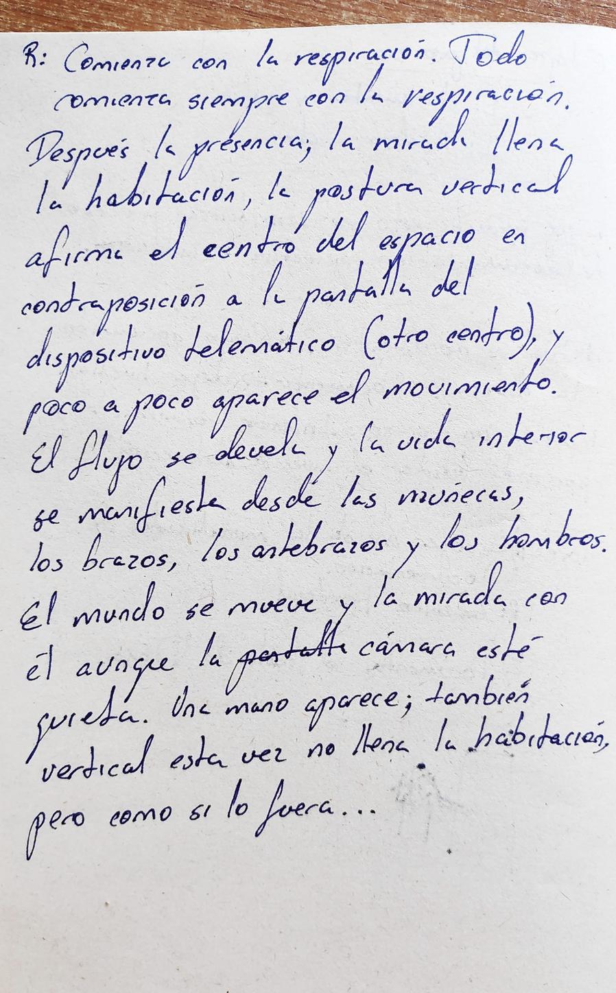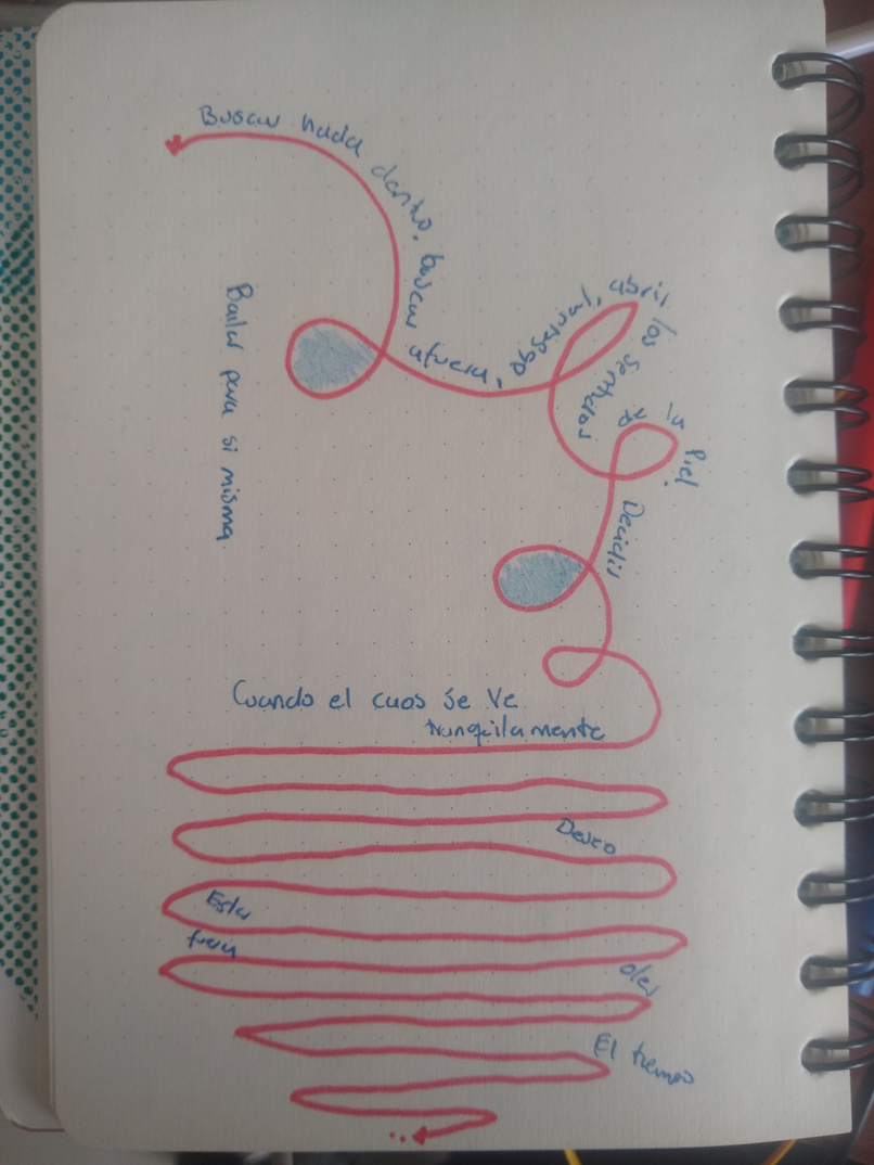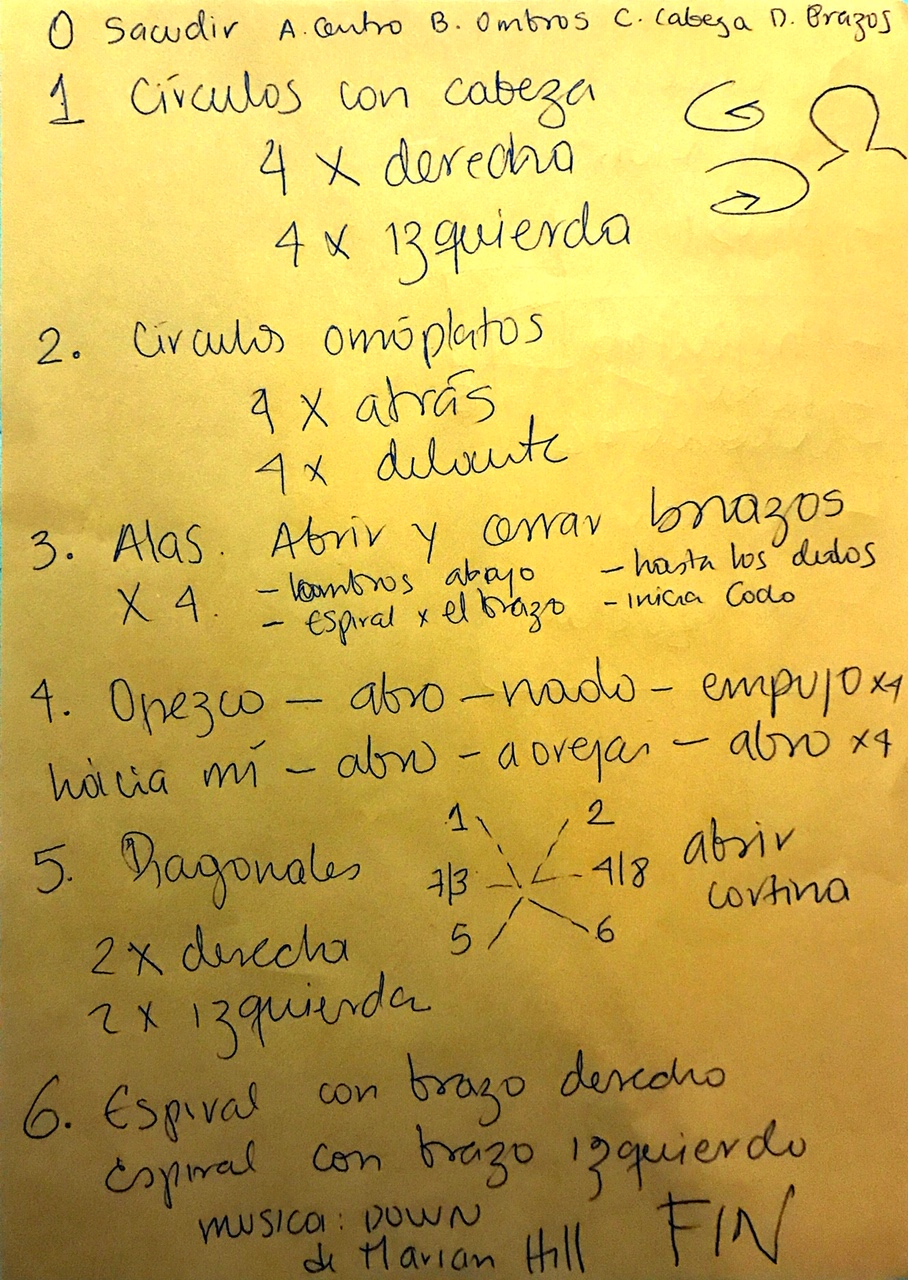 Viajo entre la rodilla que rebota, la carne que cae y la imagen de la bandejas, me quedo por un momento pensado en las bandejas, las copas, el agua, el vino que hace tanto no tomo…Vuelvo, en que van? Ahh me perdí … que delicia mover la cabeza y pensar en el rayo de luz que sale de ella.. Me quedo suspendida con esa imagen, el rayo y el placer del cuello, el peso de mi cabeza y sus pensamientos…ah me volví a perder en que van?... Ahh ya! espirales, uff siento mi culo por fuera y cuando bajo mi equilibrio es precario, menos mal se pude repetir, así tendré otra oportunidad para apretar el centro…el abdomen, las caderas, la columna que rechina. Ella cuenta en inglés y recuerdo que no puedo pronunciar el título de aquella página, de aquella película, ni el apellido de aquel director. Repite, ahora con música, el pulso, la cuenta, que bueno que podemos repetir. Cabeza, hombros, bandejas, espirales, abrir la puerta es girar, y dibujar una espiral sobre la cabeza….me quedo con ese movimiento, me suspendo, me congelo como la pantalla…vuelvo.. .en que Van?...ahh se acabó y yo hasta ahora me estaba concentrando.