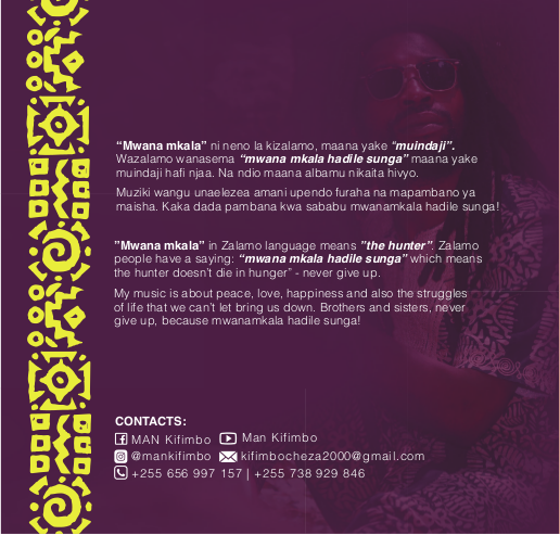As a Tanzanian afro-fusion record, I think Mwana Mkala is quite intact, regardless of the amount of different stylistic influences. It is also much more energetic than many other Tanzanian contemporary afro-fusion records, it has ”more fire”. This is because of Kifimbo´s singing, personality, and songwriting, that I tried to stay true to in all parts of the production, from the guitar sounds to the cover art. The significance of the record in the Tanzanian music scene remains to be seen, but I think the record has a lot of potential, which has been shown already. Both music videos have been playing on Tanzanian TV channels, and Kifimbo has also been invited to many radio programs to be interviewed. The song themes are very relevant in Tanzanian society, and especially the educational message of ”Simba” on HIV and the environmental themes of ”Tusikate Miti” has got people’s attention as songs of societal importance.