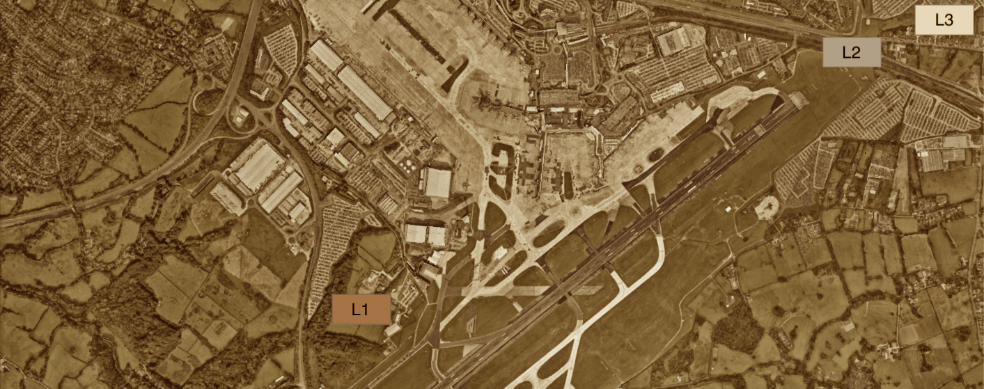 Binaural Microphones were used to record airplane sounds at Manchester International Airport in three different locations: at the airport’s runway visitor park (L1) and at two different locations behind runway 23R: in Ringway Road (just behind the runway) (L2) and in Shadowmoss Road (near the car park) (L3). The composer was able to capture a variety of sounds thanks to the three different locations. Taxiing and distant take-off/landing sounds were recorded in (L1). I was standing just behind the runway in (L2) to capture take-off sounds from the back of the airplanes. Landing sounds were clearly captured in (L3) as the composer stood closer to the runway, near the car park, under the planes approaching the runway. [Figure 1]