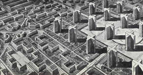 Furthermore, the design and architecture of Pardis Phase 11 could be compared to Le Corbusier’s Ville Radieuse plans (Radiant City), an unrealised urban master plan first presented in 1924. It is possible to say that Pardis Phase 11 is an exact replica of the Ville Radieuse plan’s high-density housing typologies, exact symmetry and standardisation in accordance with modernist ideas of city planning. As Le Corbusier himself explains: 'the city of today is a dying thing because its planning is not in the proportion of geometrical one fourth. The result of a true geometrical lay-out is repetition, the result of repetition is standard. The perfect form' (Merin 2013). Although the scale and size of these two projects differ, the planning and architecture styles are similar. Prefabricated high-density skyscrapers are spread across the vast barren desert landscape surrounded by mountains in the plan. There is no connection between the buildings and the landscape. The urban design and built-up form of Pardis are characterised by a repetitive rigid geometrical layout. The plan of Phase 11 has been to provide the residents with a range of zonal facilities: schools, parks, hospitals, public transportation and mosques. But after many years of construction, the implementation of such plans proved haphazard. This notion of zoning planning was also at the core of Le Corbusier's vision for his project Ville Radieuse: a planned city strictly divided into segregated sections; residential areas, commercial, entertainment and business (Merin 2013).