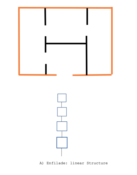 I adapted their method of space syntax analysis to uncover the socio-spatial structure. Each building plan has been colour coded to demonstrate how life is framed within this planning. These structures are designed in a linear fashion. In architecture, this type of planning and structure is referred to 'Enfilade'. Dovey describes enfilade or linear structure as a ‘string of spatial segments in sequence’ in which ‘there is no choice pathways from one segment to another’ (Dovey 2008:24). The second model is the network or ringy structure, which is the opposite of the enfilade model in that there is a connection between each section and access to different parts of the plan. The third plan is the fan or branching model, which Dovey explains 'controls access to a range of spaces from a single segment, like a corridor or hallway in practice, nearly all buildings are structured in a combination of these basic syntactic structures' (24). Although these three plans are similar, they each have a unique spatial structure that will determine different social relations. As evidenced by the works and colour-coding analysis presented here, the developers and organisers of the Pardis 11 project used the enfilade or linear structure planning in all of the tower houses. Analysing the enfilade or linear structure reveals that, in this type of planning, the degree of control in each section of the plan is greater than the other two. Dovey observes that 'the linear or fanned structure controls circulation and social interaction in certain key spaces, the degree of 'control' of a given cell is the degree to which access to other cells must pass through it' (24).