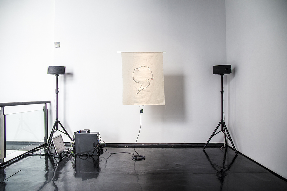 Entirely realized with open-source hardware/software technologies, the work is based on a sound mapping of the Antarctic peninsula, made by the artist in 2009. It allows participants to interact with field recordings captured at very low frequencies and to excavate the landscape through listening.[10] Through questioning concepts of the sublime and the imperceptible, Pérez Núñez crosses disciplinary boundaries, analyzing hidden military operations and technological accidents in Antarctic ecosystems. The installation, which includes four loudspeakers arranged in the corners of a 4m2 room and a wall-mounted TV, characteristically converges different media and technologies: movement sensors that identify the spectator’s position generate the soundscape in which they move; a hand-sewn fabric map references Antarctica’s points of exploitation; and a video, which displays software data as still and moving images and as background noise, confuses the media narrative, representing entropy and alluding to an information blackout.