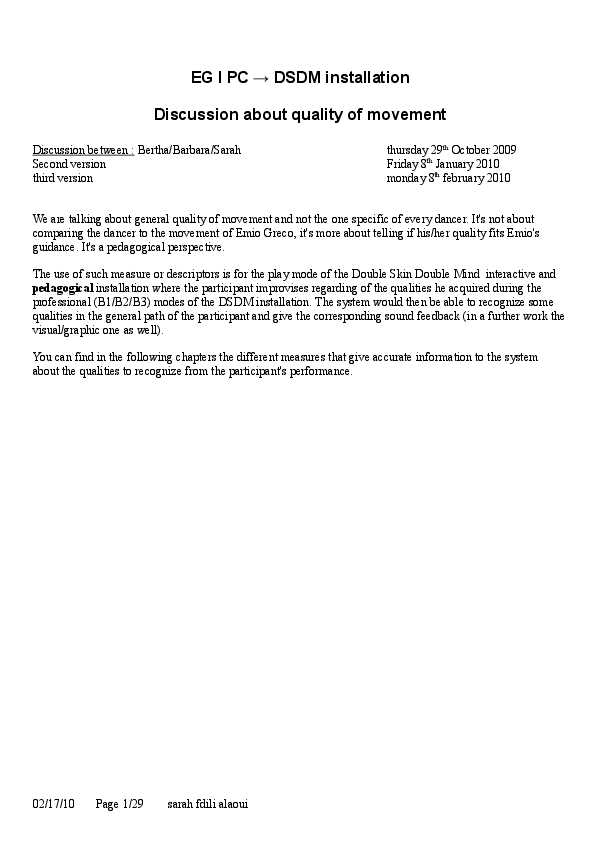 The Interactive Installation Double Skin/Double Mind is a virtual interactive version of the Double Skin/Double Mind workshop. This workshop, which has been taught by dance company Emio Greco | PC since 1996, represents the basis of the creative work of choreographers Emio Greco and Pieter C. Scholten. Participants in this workshop are challenged to discover new interpretations of their dancing body through the movement tracking program Gesture Follower developed by Frédéric Bevilacqua (IRCAM). As result of this comparison different feedback, including emotive icons, sonification and text displays is given through an interface lay out developed by Chris Ziegler. Participants are accompanied by different visualization and sonic information while mentally and physically travelling through the Double Skin/Double Mind structure. Professional as well as non-professional dancers are invited to experience this installation.