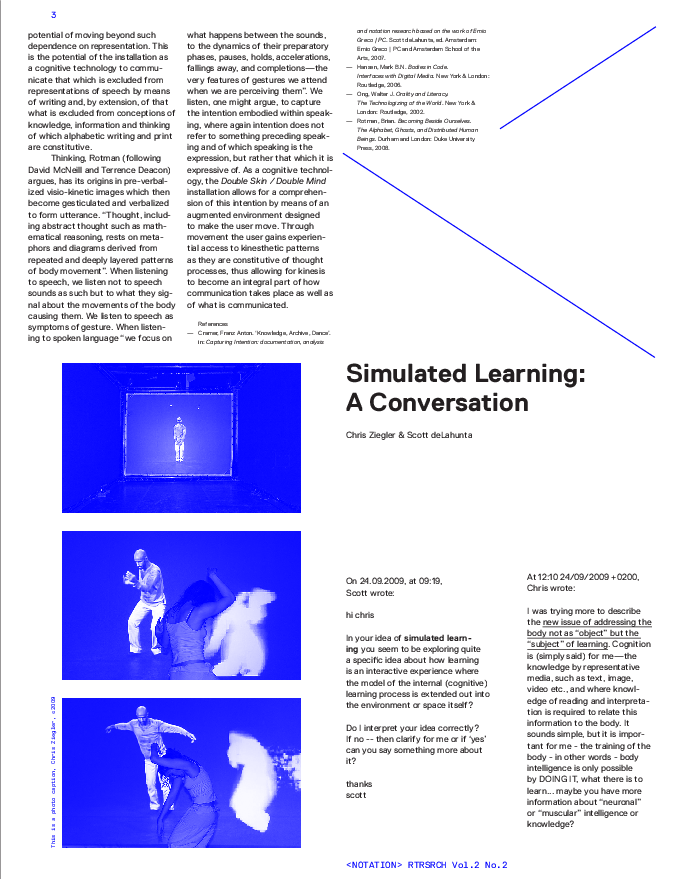 The Interactive Installation Double Skin/Double Mind is a virtual interactive version of the Double Skin/Double Mind workshop. This workshop, which has been taught by dance company Emio Greco | PC since 1996, represents the basis of the creative work of choreographers Emio Greco and Pieter C. Scholten. Participants in this workshop are challenged to discover new interpretations of their dancing body through the movement tracking program Gesture Follower developed by Frédéric Bevilacqua (IRCAM). As result of this comparison different feedback, including emotive icons, sonification and text displays is given through an interface lay out developed by Chris Ziegler. Participants are accompanied by different visualization and sonic information while mentally and physically travelling through the Double Skin/Double Mind structure. Professional as well as non-professional dancers are invited to experience this installation.