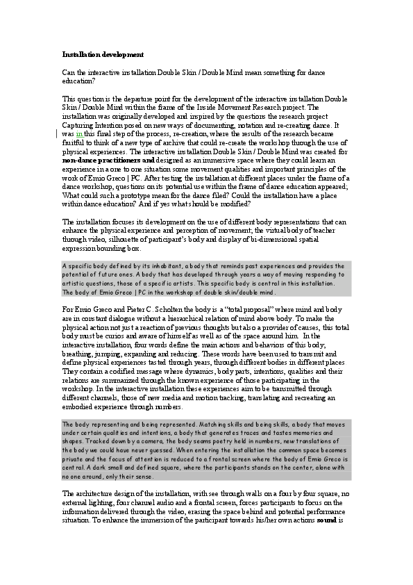 The Interactive Installation Double Skin/Double Mind is a virtual interactive version of the Double Skin/Double Mind workshop. This workshop, which has been taught by dance company Emio Greco | PC since 1996, represents the basis of the creative work of choreographers Emio Greco and Pieter C. Scholten. Participants in this workshop are challenged to discover new interpretations of their dancing body through the movement tracking program Gesture Follower developed by Frédéric Bevilacqua (IRCAM). As result of this comparison different feedback, including emotive icons, sonification and text displays is given through an interface lay out developed by Chris Ziegler. Participants are accompanied by different visualization and sonic information while mentally and physically travelling through the Double Skin/Double Mind structure. Professional as well as non-professional dancers are invited to experience this installation.