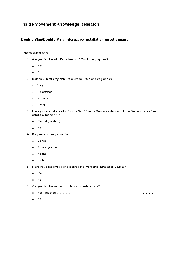 The Interactive Installation Double Skin/Double Mind is a virtual interactive version of the Double Skin/Double Mind workshop. This workshop, which has been taught by dance company Emio Greco | PC since 1996, represents the basis of the creative work of choreographers Emio Greco and Pieter C. Scholten. Participants in this workshop are challenged to discover new interpretations of their dancing body through the movement tracking program Gesture Follower developed by Frédéric Bevilacqua (IRCAM). As result of this comparison different feedback, including emotive icons, sonification and text displays is given through an interface lay out developed by Chris Ziegler. Participants are accompanied by different visualization and sonic information while mentally and physically travelling through the Double Skin/Double Mind structure. Professional as well as non-professional dancers are invited to experience this installation.