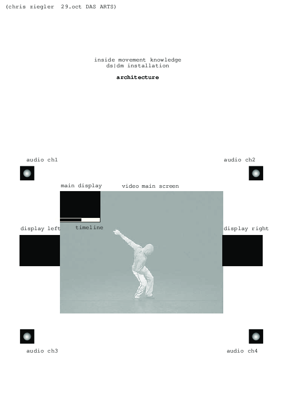 The Interactive Installation Double Skin/Double Mind is a virtual interactive version of the Double Skin/Double Mind workshop. This workshop, which has been taught by dance company Emio Greco | PC since 1996, represents the basis of the creative work of choreographers Emio Greco and Pieter C. Scholten. Participants in this workshop are challenged to discover new interpretations of their dancing body through the movement tracking program Gesture Follower developed by Frédéric Bevilacqua (IRCAM). As result of this comparison different feedback, including emotive icons, sonification and text displays is given through an interface lay out developed by Chris Ziegler. Participants are accompanied by different visualization and sonic information while mentally and physically travelling through the Double Skin/Double Mind structure. Professional as well as non-professional dancers are invited to experience this installation.