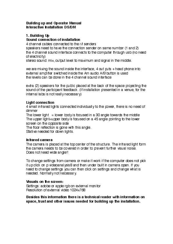 The Interactive Installation Double Skin/Double Mind is a virtual interactive version of the Double Skin/Double Mind workshop. This workshop, which has been taught by dance company Emio Greco | PC since 1996, represents the basis of the creative work of choreographers Emio Greco and Pieter C. Scholten. Participants in this workshop are challenged to discover new interpretations of their dancing body through the movement tracking program Gesture Follower developed by Frédéric Bevilacqua (IRCAM). As result of this comparison different feedback, including emotive icons, sonification and text displays is given through an interface lay out developed by Chris Ziegler. Participants are accompanied by different visualization and sonic information while mentally and physically travelling through the Double Skin/Double Mind structure. Professional as well as non-professional dancers are invited to experience this installation.