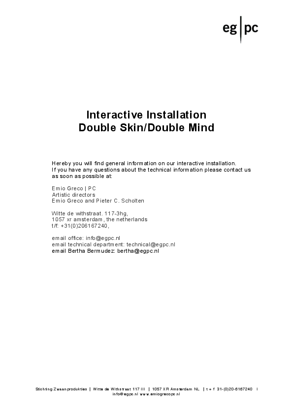 The Interactive Installation Double Skin/Double Mind is a virtual interactive version of the Double Skin/Double Mind workshop. This workshop, which has been taught by dance company Emio Greco | PC since 1996, represents the basis of the creative work of choreographers Emio Greco and Pieter C. Scholten. Participants in this workshop are challenged to discover new interpretations of their dancing body through the movement tracking program Gesture Follower developed by Frédéric Bevilacqua (IRCAM). As result of this comparison different feedback, including emotive icons, sonification and text displays is given through an interface lay out developed by Chris Ziegler. Participants are accompanied by different visualization and sonic information while mentally and physically travelling through the Double Skin/Double Mind structure. Professional as well as non-professional dancers are invited to experience this installation.