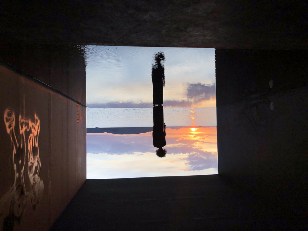 Aram BARTHOLL, The Perfect Beach, 2018, two performers, aluminium frames, 250 x 440 cm