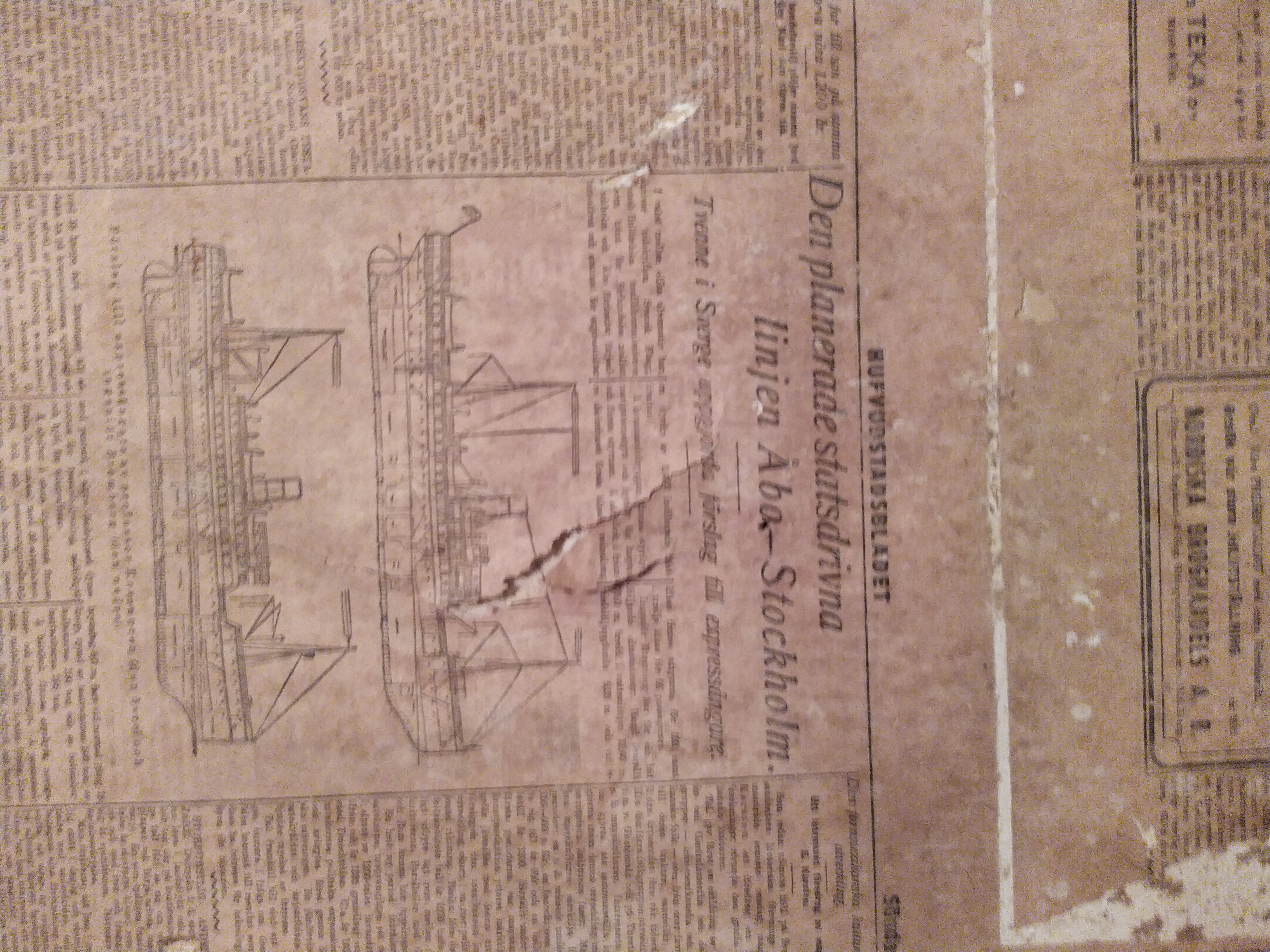 Winter, 1923 — The cracks in the wall expose previous iterations of the residency building. The external layer of paint covering the apartments is falling apart. The walls were protected by newspaper glued to them. A glimpse of past futurity emerges—December 16, 1923. The Hufvudstadsbladet is the most circulated Swedish-Finn newspaper. A new line of ferries between Turku and Stockholm is planned for 1924.