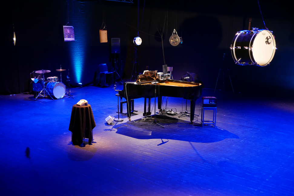 The software instrument system is in turn connected to a setup of transducers attached to acoustic instruments, embodying the disembodied recorded voices in a physical electroacoustic orchestra that blurs the line between the electric and acoustic, voice and instrument, and between virtual and real.