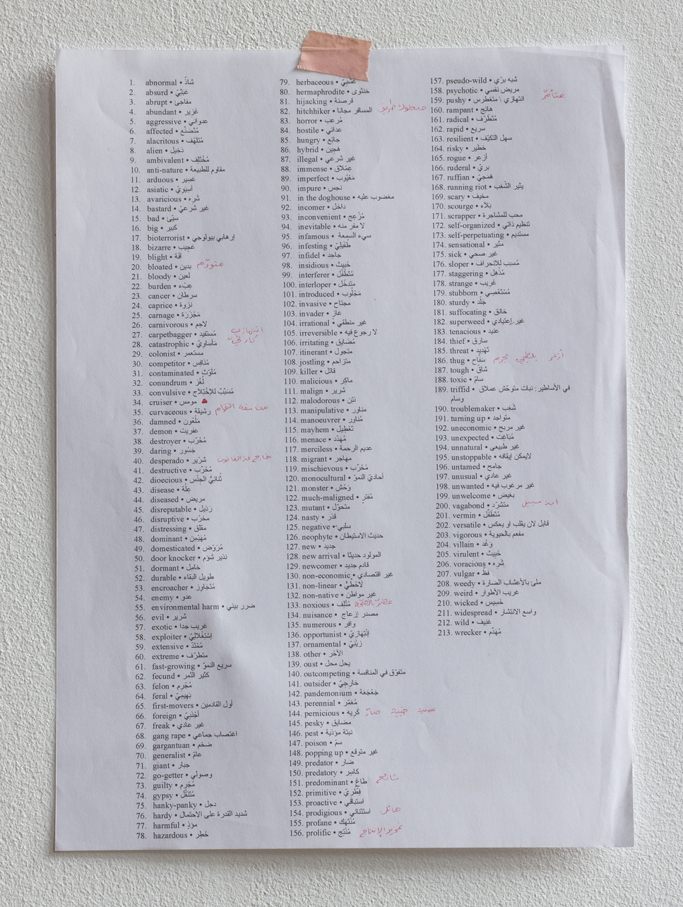 My practice is centred around developing and experiencing alternative trajectories where values of (re)presentation, translation, viewing, reading, and understanding intersect. This is mainly done through looking at language which we use to communicate, share or exchange information, news and ideas; language which we receive, listen to, or hear; and other forms which were committed to oblivion—daily life dialects, particularly in the Arab world. Yet “new” ways of weaving the political value of the artwork in non-political affairs – if such things exist – constitute the core of questions about how to approach and (re)present a certain place and its language. How could a field-tour of observing flora be the pretext for addressing landscape, history, and colony planning? How does a process of collecting words from two different spoken languages / dialects comment on and contribute to a friendship and (oral) history at once? And why would studying the influence of invasive species be the trigger of accumulating consequences that provoke thinking about a society, its language, its media, and its behavioural economics? These multilayered concerns on the essence of the artwork, its production, its politics, and its language stimulate the ways of my seeing, together with other aesthetical matters of how to juxtapose static photographs with moving images (video), and (written/outspoken) texts / words. How can these concerns comprehensively convey personal and common experience/s of the individual and the collective, without ignoring actual events and (past) histories that shape memory?