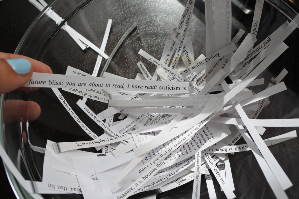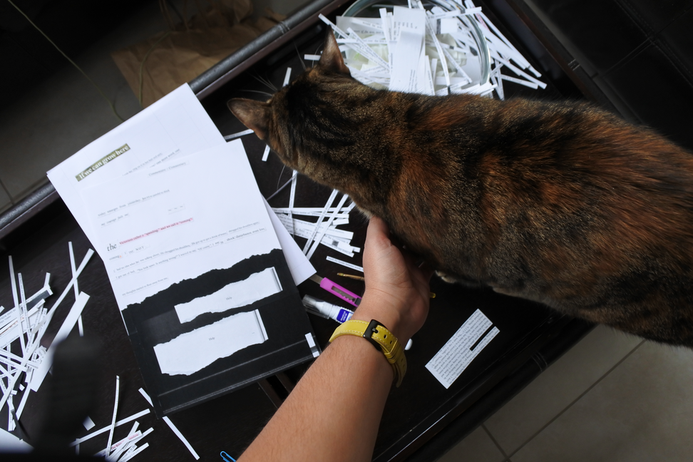 My current research interest is in print- and paper-based contemporary multimodal literature, focusing on emergent and critically neglected texts from the past twenty years, such as Safran Foer’s Tree of Codes (2010) and Abrams’ and Dorst’s S (2013). My initial inquiry emerged from an interest in Barthes’ The Pleasure of the Text (1973) which provoked me to think instead about ‘the pleasure of paper’, that is, about how paper stimulates pleasurable responses in print-based texts and, subsequently, the various affective responses that emerge from the fusions of textual, visual and tactile devices on paper. Building on this, my creative-critical PhD project explores the relationship between text and its surfaces to ask how paper allows for both literary and artistic innovation. A preliminary question is: in what ways does the material encounter with paper provoke sensory and emotional stimulation? My multilingual upbringing feeds into the undercurrents of my research and practice – I enjoy exploring the ‘in-betweenness’ or liminality of linguistic representation in artistic practice. I am interested in how emergent theories on materiality might provoke deeper thought on the forces that the paper object exerts beyond its capacity to embody textual imprint. Further, my research process is embodied by a sense of ‘feeling into’ which involves exploring the various devices simultaneously at play in the work I am researching through the performance of acts tied with them, allowing myself to physically come to questions (or answers and hypotheses). See ‘On Making Cuts’ below, for an example of this in my practice.
