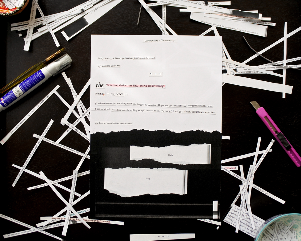 The process of making a cutup, for me, is driven on the one hand by an interest in the mysticism surrounding the works of Tzara, who stated that if you pull cut words out of a bag and arrange them in the order that they have been selected ‘the poem will be like you’ (‘To Make a Dadaist Poem’, 1920), and Burroughs, who spoke frequently of the divinatory power of cutup (e.g. Break Through in the Gray Room, 1986). On the other hand, it is driven by contemporary thought on new materialisms that discuss the forces that objects have within them and are capable of exerting on us. (e.g. Samb, ‘Objects speak. But speak their own language’, 2010). In some ways my practice hovers in between these: by researching through doing, by making cutups as a means of thinking about them, my practice allows the liminal space between the mystic and the material to unfold. It was difficult for me to think critically of cutups before having experienced the ennui of looking for a connecting word in piles of shredded paper or having felt the tack of drying glue under my nails and on the edges of my fingers where small bits of punctuation had become stuck. But giving in to the process and letting go of my compulsions to have order, to clean my fingertips after every contact with ink or glue, to search for specific words, allowed the text to emerge on its own terms, and allowed in some ways the paper to speak for itself.