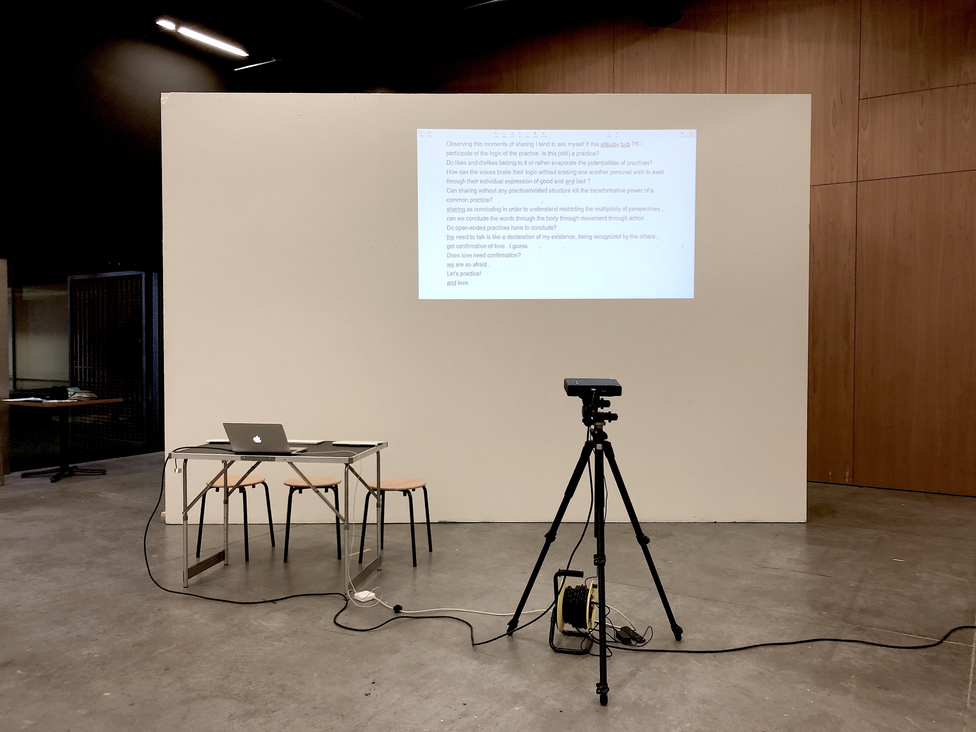 “Exploratory essay writing” is a practice that enables a very slow aesthetic observation of a concept. The starting point is a state of not-knowing the concept to be addressed. Being aware that the concept at stake has already a meaning for me, I position myself towards this concept as if I would encounter it for the first time. This encounter is enabled by specific technologies of writing (usually my laptop) and my bodily actions, both embedded in a situation typically conditioned by a certain furniture and architectural constructions. To write very slowly allows me to become operatively aware of the actualization of the agencies of all these entities (technologies, my body, my surroundings) and of the agencies of the emerging text. Consequently, the process of writing develops in and by virtue of a field of shared agencies. This requires to regulate in a very specific way the performance of my intentionality. While writing I pursue neither cognitive nor formal goals. Instead, I reduce the exercise of my intentionality to the maintenance of my interactions on a sensorimotor and emotional base and thus to be extremely receptive to the process of writing and the ways in which the observed concept reacts, that is, the possible transformations of its phenomenal presence. Currently I am extending this practice in different ways: reading my essays publicly and trying different forms of collective writing both in architectural (semi)public spaces and in online frameworks.
