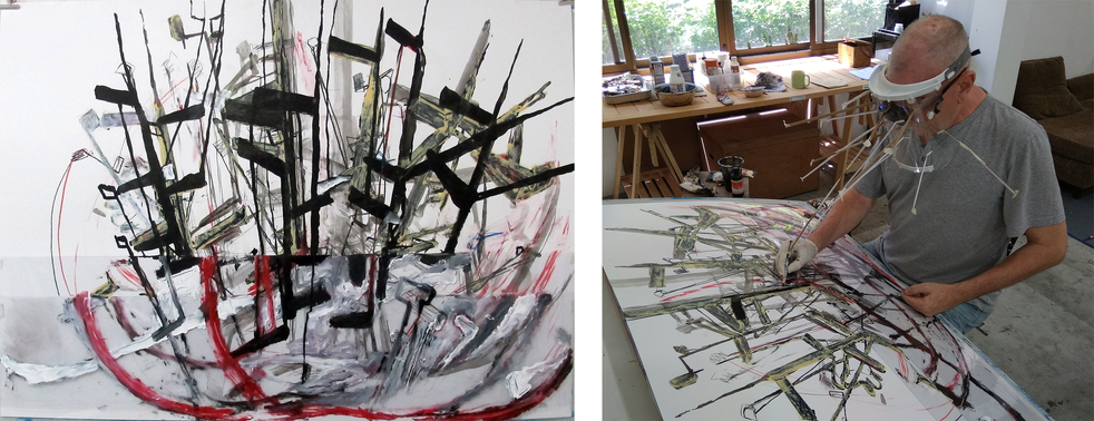 1. Interaction of Paper Tabs within and as Space, Dermatograph pencils, black ink, acrylic on laminated white cardboard, oil paint on clear plastic overlay, 109 x 79cm. + artist at work on the drawing. 2020