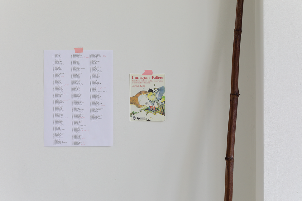 1. - 3. Installation detail (Weed Control group exhibition). Image of a book cover, segment of a Japanese knotweed stick, A4 sheet of research terms translated into Arabic, digital. Photo credit Romy Finke (Van Eyck Academy), 2020.