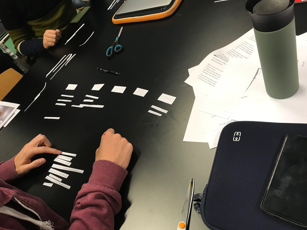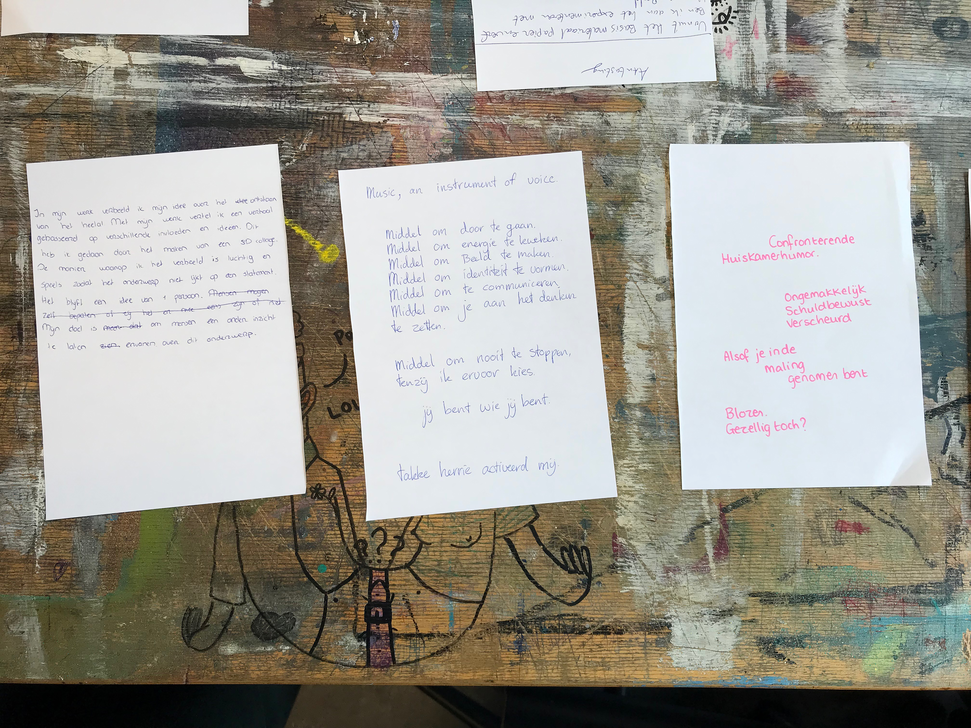 (1) The students are asked to bring in a text that inspires them. From these texts, they cut out words and sentences that appeal to them. They divide these cut-outs into categories such as ‘object’, ‘space’, ‘thoughts’, etc. on the same table. The students read some of the selected texts out loud to get a feel for the quality (tone, rhythm, feel) of the language. They then select whatever text resonates with them, and that they feel says something about their art, and use this to create a visual poem on A5 paper. After looking at the results, they reflect on them in groups of three. They are provided with a list of questions like: ‘Why did these words/sentences appeal to you?’ and ‘What do you hope an outsider would pick up on when seeing this text?’ One student asks questions, one responds, and the third writes down the answers. After everyone’s work is discussed, the students write down their insights.