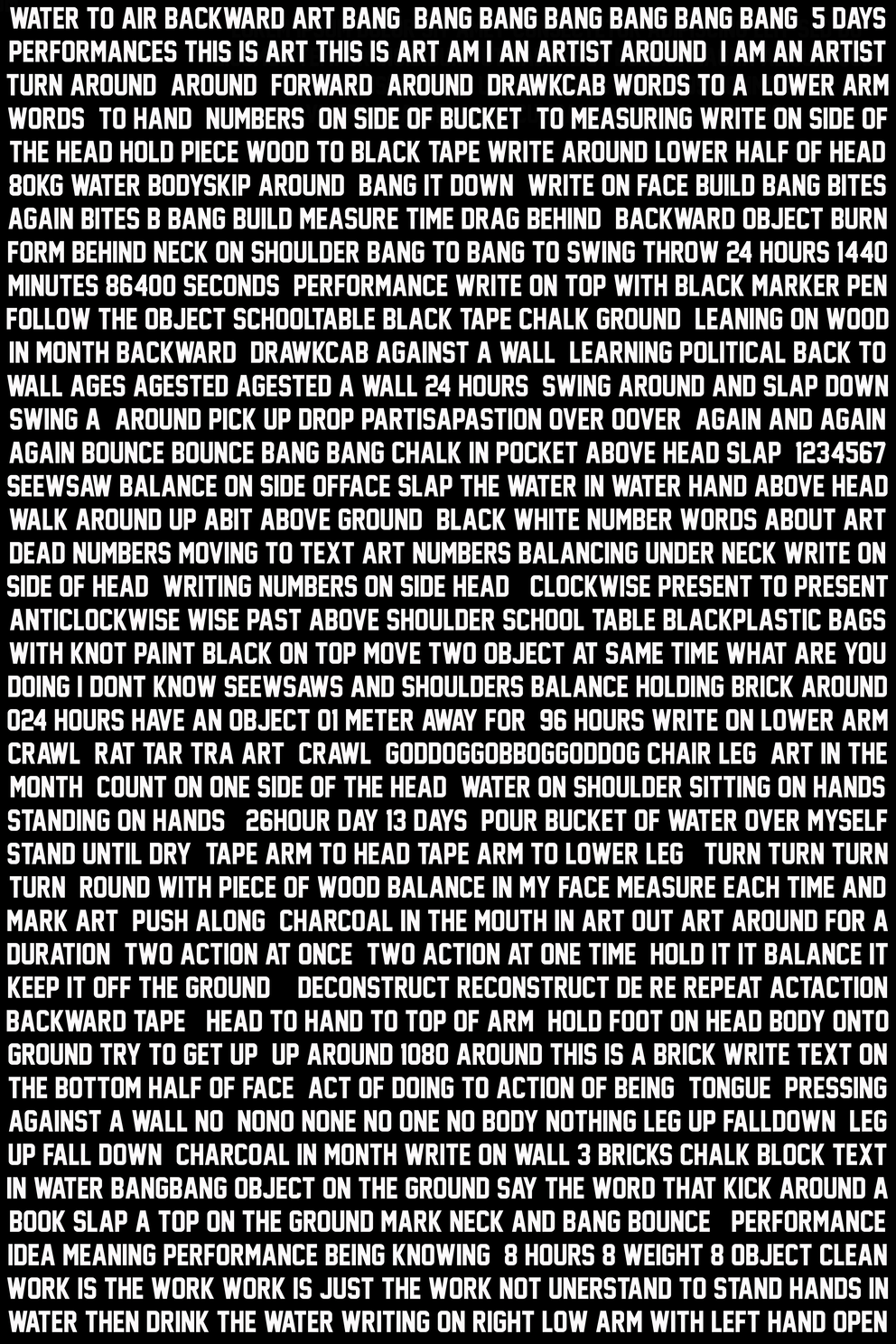 When Court writes ‘Object in mouth and try to move or talk at the same time’, the performance task is purposefully made difficult: there is no direct path from performance idea to performance being. These ideas are indirect paths towards understanding. By appropriating the mouth and ear as spaces in which to hold and carry objects in performance his mouth / ear become physically linguistic. Instead of performing their function as emitting and receiving sound they are become linguistic limbs, to hold and move objects as if they were language. As Court notes his practice uses ‘object[s] as a written language’, an indication of his exploration of words and writing as fundamental to his practice."
