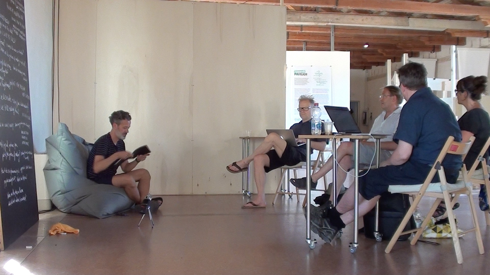 2. Framed dialogue on “not-knowing” in the framework of “lecturing as phenomenological research practice” as part of the research cell “Through Phenomena Themselves” (Research Pavilion #3, Venice, June 13 2019). With Esa Kirkkopelto, Mika Elo, Emma Cocker and Juha Himanka. Copyright: Alex Arteaga.