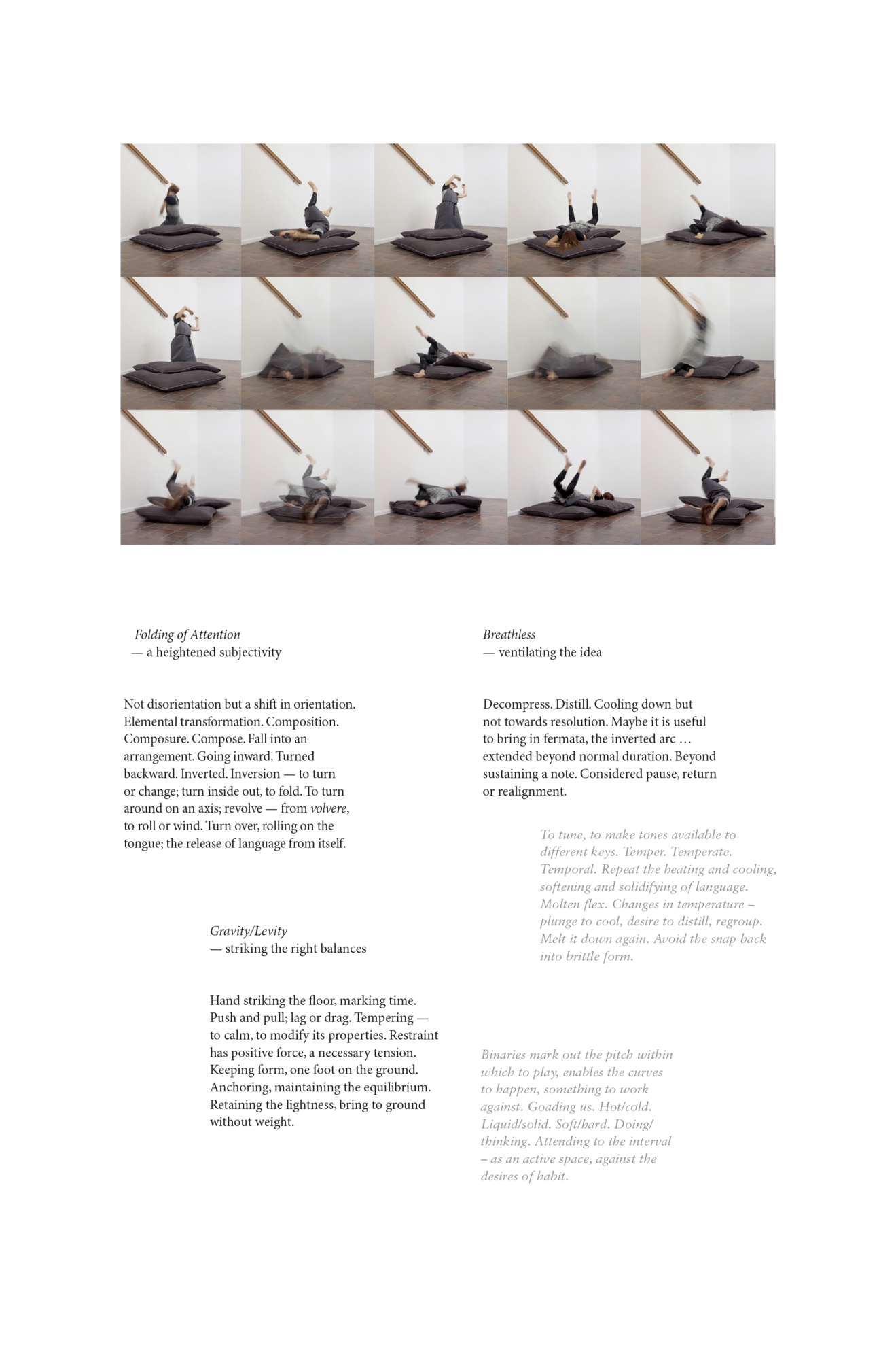 Conversation-as-material is a practice of ‘writing without writing’ that I have developed through a series of artistic research collaborations including Re— (with Rachel Lois Clapham); The Italic I (with Clare Thornton) and Choreographic Figures: Deviations from the Line (with Nikolaus Gansterer and Mariella Greil). Within this approach, conversational dialogue is conceived not as a means for reflecting on or about practice but as a generative practice in-and-of-itself, site and material for the construction of inter-subjective and immanent modes of linguistic ‘sense-making’ emerging from the enmeshing of different voices in live exchange. Conversation-as-material involves the quest for a not-yet-known vocabulary emerging synchronous to the live circumstances that it seeks to articulate. Here, meaning does not exist prior to utterance but rather is co-produced through the dialogic process itself, with recorded dialogue transcribed and then distilled to reveal an emergent infra-personal textual poetics.