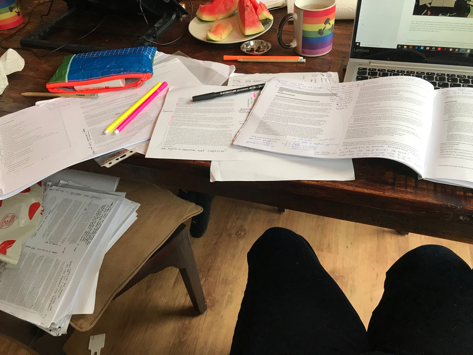 For me, writing is about creating, about exploring, about trying to capture thoughts and feelings in words. And this is a messy business. My workroom, when I am in the middle of a writing process, has been described as ‘that of a nutty professor’, and ‘the aftermath of a hurricane passing through.’ I need the work to be tangible. For me, writing is a physical act. I walk around the room, I read texts out loud, cut them up. I have different versions of texts lying around and my walls are filled with mind maps. Reflections are scribbled in the margins. But when you see the final version of a text, you may never expect the chaotic process that led to the polished end result.
