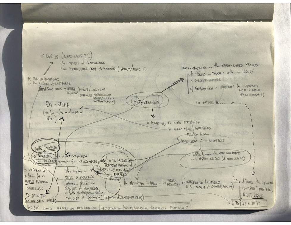 1. Diagram for the framed dialogue on “not-knowing” in the framework of “lecturing as phenomenological research practice” as part of the research cell “Through Phenomena Themselves” (Research Pavilion #3, Venice, June 13 2019). Copyright: Alex Arteaga