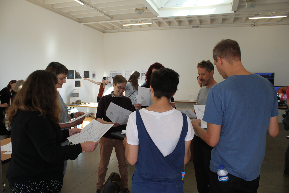 The work is experimental in the sense that it explores ‘meaning’ as an event, rather than a static property of something. During the activity the status of language shifts between descriptive, declamatory and rhythmic, with the printed text using the formation of the words on the page to explore how shifts of emphasis in the language are taken up by a body of speaking people. Language is used to make many bodies become one, before dissolving again into distinct entities.