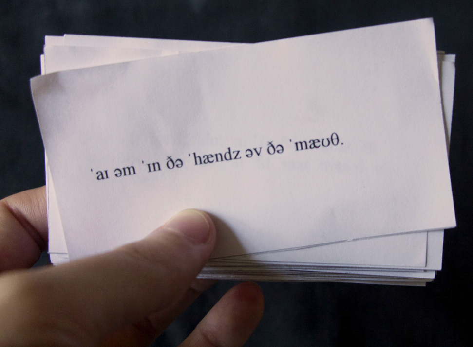 The work prɑpər ˈspiːtʃ takes its point of departure from the practice of proper speech and how the linguistic norms and laws that it abides under has its roots in ideology and the idea of civilized discourse (as opposed to the "primitive" sounds of the "sub-human"). I'm interested in the connection between speech and body, how the mouth is schooled by incorporating the practice of proper speech, how the movements of the mouth is tied to the plays of power, and how the learning of proper speech is a way to exercise power over the bodies of the speakers by making them incorporate and internalize a linguistic and grammatical structure.
