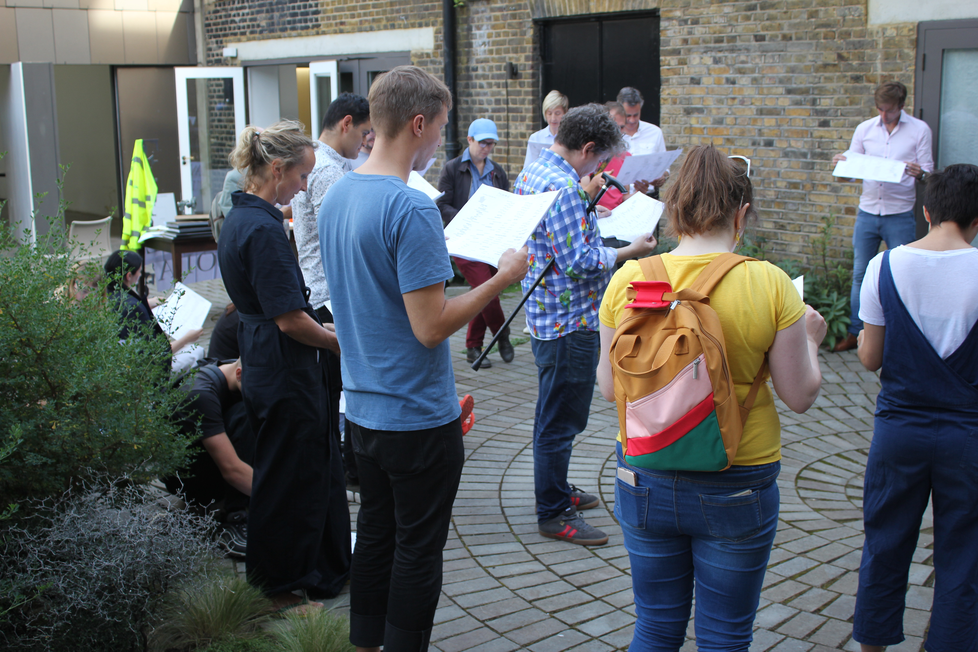 This activity borrows from other contexts where voices are joined in unison to make an event or event seem more important or permanent. Marriage ceremonies, pledges of allegiance, acts of Parliament, the tradition of chorus in classical Greek theatre, cantatory magic, carol singing, meditational chanting and many other rituals and social activities form a background to this work.