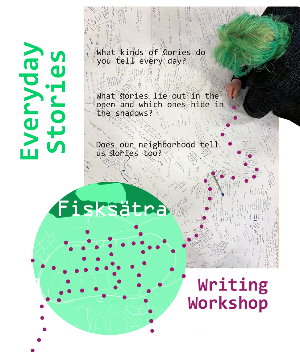 A neighbourhood such as Fisksätra can be a physical place in which people dwell together, or a threshold to other places, a portal to stories which allow us to inhabit a place we are no longer in or have not yet visited. Storytelling can give us a sense of being ‘here and elsewhere’, can transport us to other worlds, at least for a time. In Fisksätra and other communities across the world, the everyday is something experienced both individually and collectively, in our similarities and differences; a kind of lived narration of routine and small surprises; a politics of our day-to-day lives; a series of stories we embody.