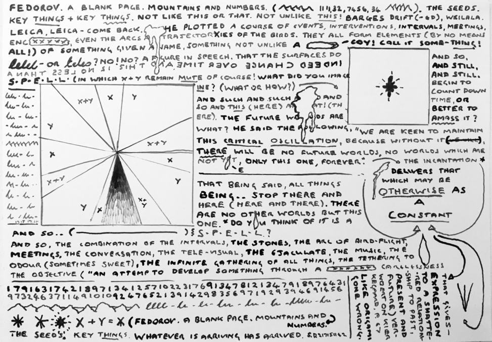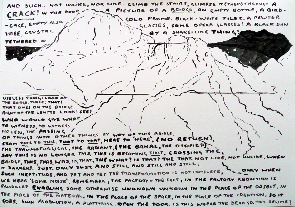 My practice and research forms a constellation of approaches which perform relationships between the acts of speaking / writing / drawing / reading and thinking. I aim to occupy and disrupt the ontological frames of writing, drawing and speaking, to create and inhabit a hybrid space and time, generating new forms and thinking around the nature of verbal, visual, performative, textual forms of language. A wide range of materials and methodologies are employed as a means to effectively reflect upon and challenge one another, including drawings, drawing as performance, written texts, text animations, text painting, sound pieces in the form of spoken word performances via digital avatars, digital prints, and published work in journals. The methods employed are conspicuously varied so that each process could be somehow inhabited, or confronted, by another, e.g. writing in drawing, drawing in speaking. This unruliness of method is central to the nature of my enquiries. What is at stake is a flickering between utterance and glossolalia, where, in linguistic terms, everything may be permissible and as a consequence nothing may be fixed. Lately I have been trying to imagine and work with this movement as a potential site in itself, and a body of work currently under way concerns this thinking of this site as a form of quasi-linguistic architecture. It is therefore important that I do not break down the work into separate practices, as the fluctuation of approach throughout my work is the practice.