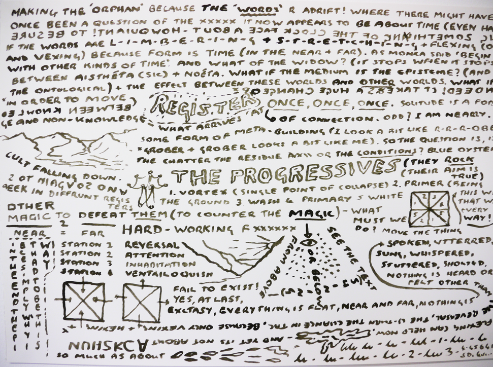 My practice and research forms a constellation of approaches which perform relationships between the acts of speaking / writing / drawing / reading and thinking. I aim to occupy and disrupt the ontological frames of writing, drawing and speaking, to create and inhabit a hybrid space and time, generating new forms and thinking around the nature of verbal, visual, performative, textual forms of language. A wide range of materials and methodologies are employed as a means to effectively reflect upon and challenge one another, including drawings, drawing as performance, written texts, text animations, text painting, sound pieces in the form of spoken word performances via digital avatars, digital prints, and published work in journals. The methods employed are conspicuously varied so that each process could be somehow inhabited, or confronted, by another, e.g. writing in drawing, drawing in speaking. This unruliness of method is central to the nature of my enquiries. What is at stake is a flickering between utterance and glossolalia, where, in linguistic terms, everything may be permissible and as a consequence nothing may be fixed. Lately I have been trying to imagine and work with this movement as a potential site in itself, and a body of work currently under way concerns this thinking of this site as a form of quasi-linguistic architecture. It is therefore important that I do not break down the work into separate practices, as the fluctuation of approach throughout my work is the practice.