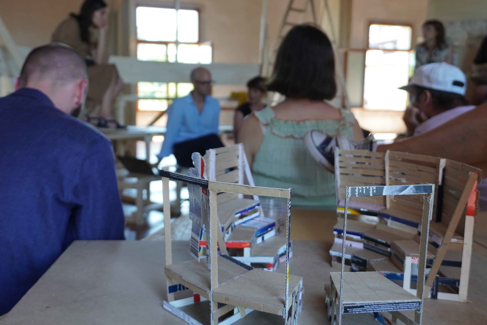 1. Meeting on language-based practices, in Convocation, Research Pavilion, Venice, 2019, taking place in the collectively built Temporary Agora by Anni Laakso & Disruptive Processes. Photograph by Mika Elo.