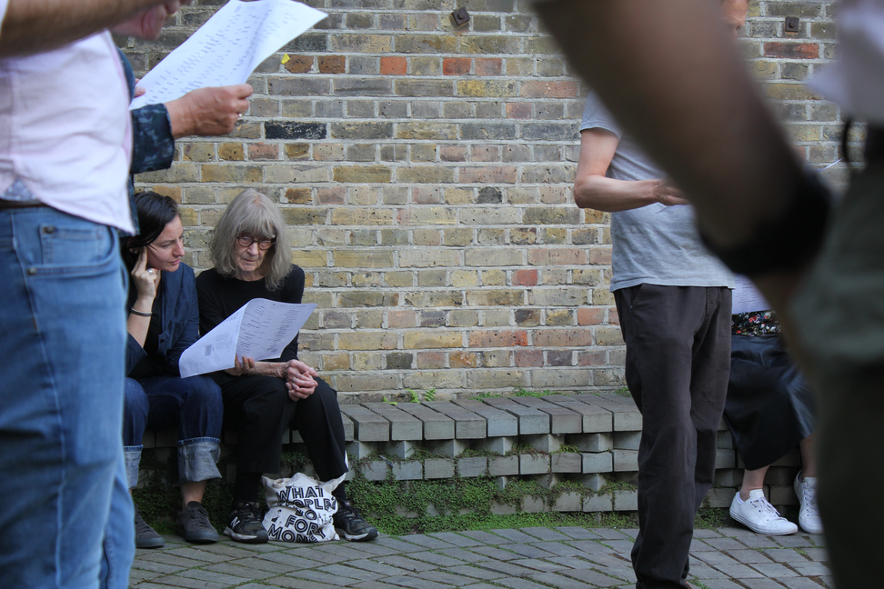 The work is experimental in the sense that it explores ‘meaning’ as an event, rather than a static property of something. During the activity the status of language shifts between descriptive, declamatory and rhythmic, with the printed text using the formation of the words on the page to explore how shifts of emphasis in the language are taken up by a body of speaking people. Language is used to make many bodies become one, before dissolving again into distinct entities.