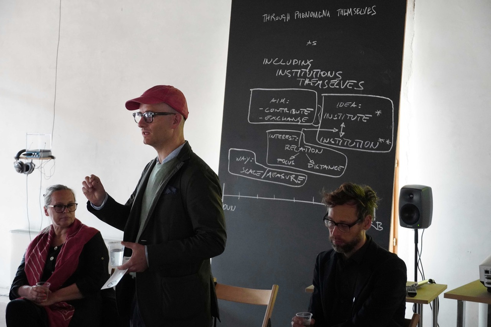 2. INCLUDING INSTITUTIONS THEMSELVES, a public morning discussion as a contribution of the exchange in the cell “Through Phenomena Themselves” at the Research Pavilion #3 in Venice 2019. Photograph by Mika Elo.